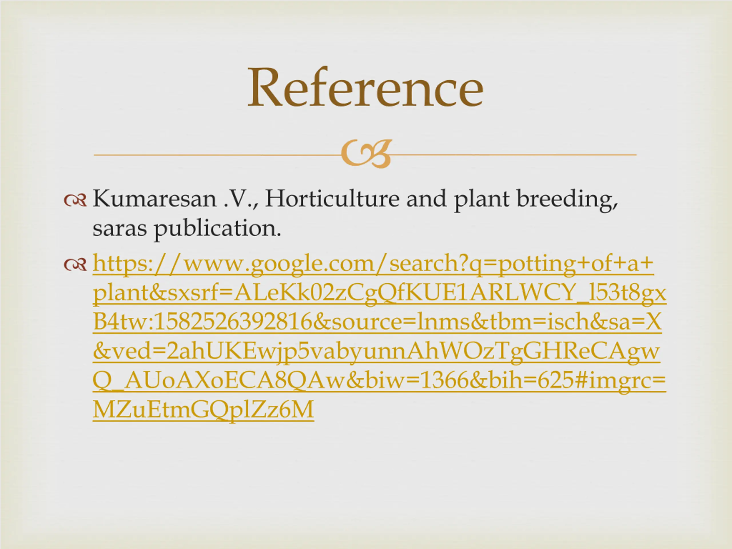 Reference Kumaresan .V., Horticulture and plant breeding, saras publication. https://www.google.com/search?q=potting+of+a+ plant&sxsrf=ALeKk02zCgQfKUE1ARLWCY_l53t8gx B4tw:1582526392816&source=lnms&tbm=isch&sa=X &ved=2ahUKEwjp5vabyunnAhWOzTgGHReCAgw Q_AUoAXoECA8QAw&biw=1366&bih=625#imgrc= MZuEtmGQplZz6M
