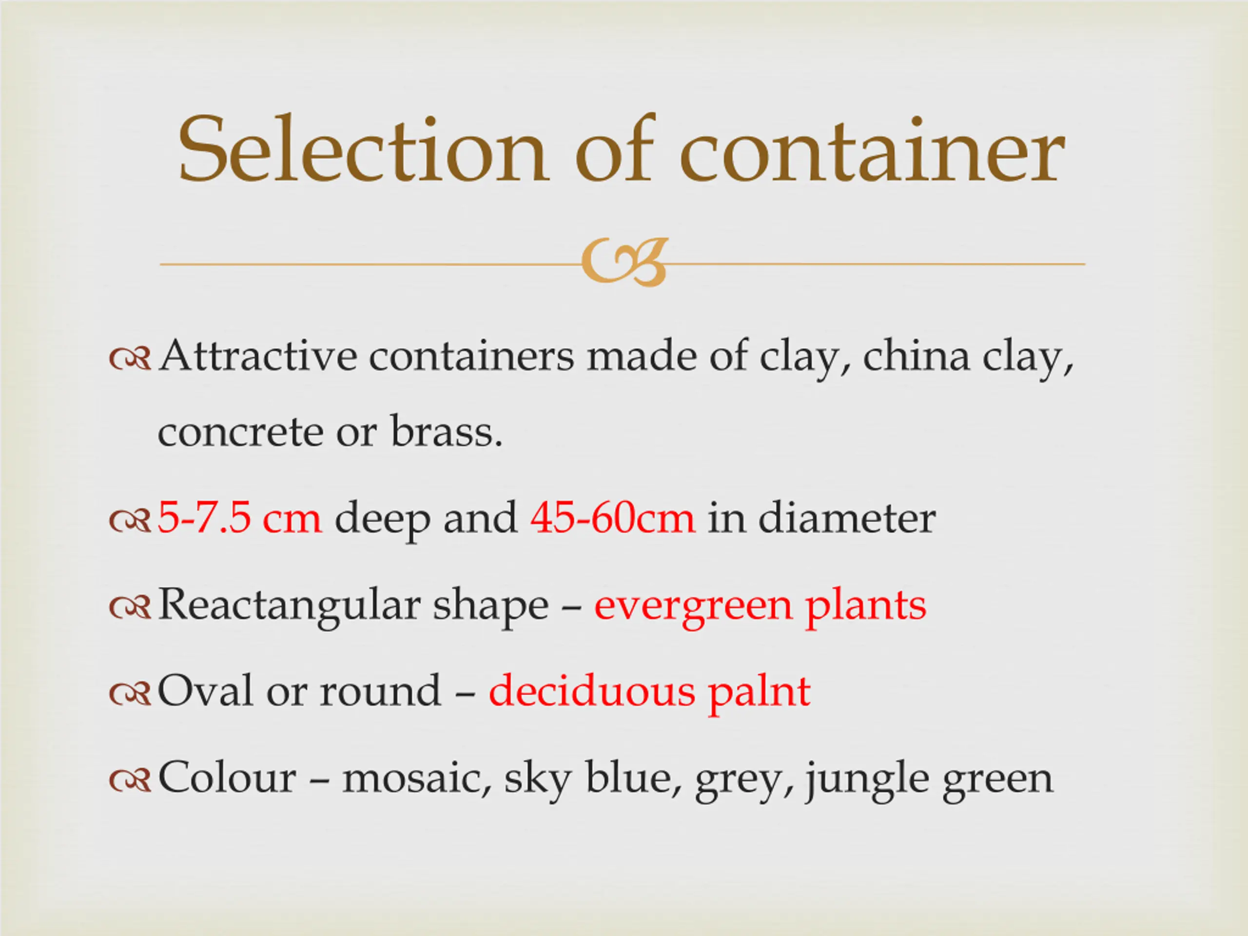 Selection of container Attractive containers made of clay, china clay, concrete or brass. 5-7.5 cm deep and 45-60cm in diameter Reactangular shape evergreen plants Oval or round deciduous palnt Colour mosaic, sky blue, grey, jungle green
