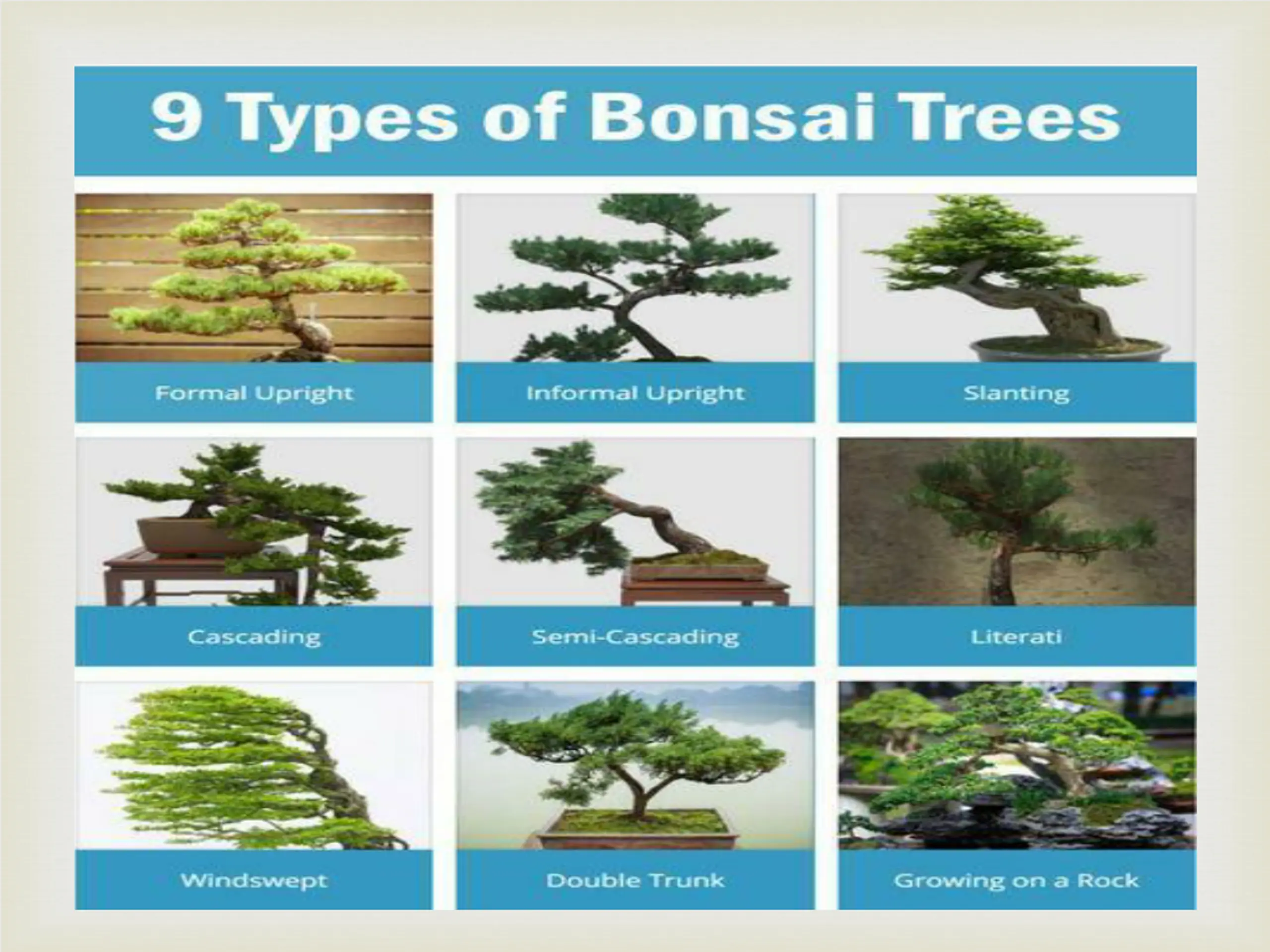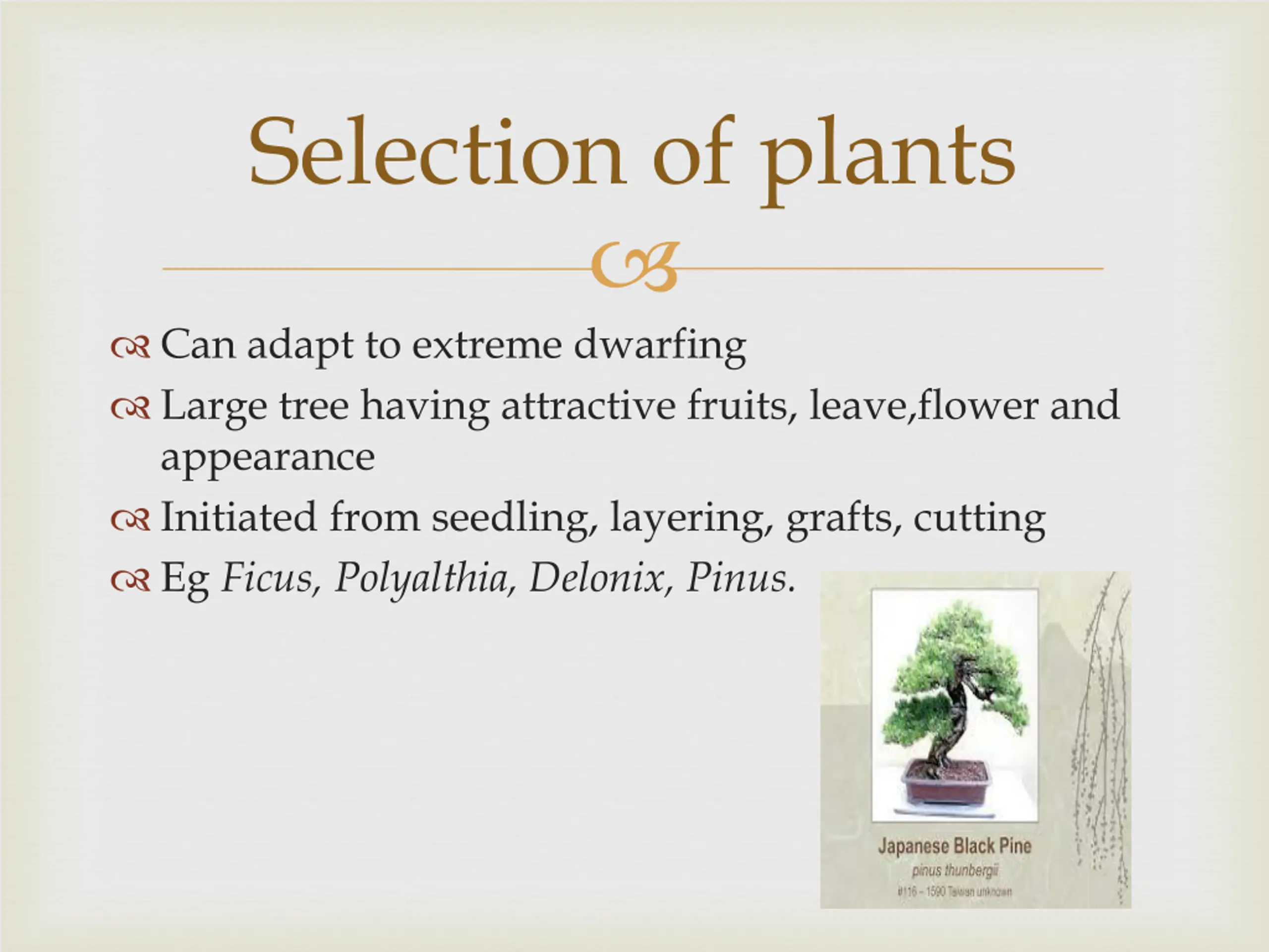 Selection of plants Can adapt to extreme dwarfing Large tree having attractive fruits, leave,flower and appearance Initiated from seedling, layering, grafts, cutting Eg Ficus, Polyalthia, Delonix, Pinus.