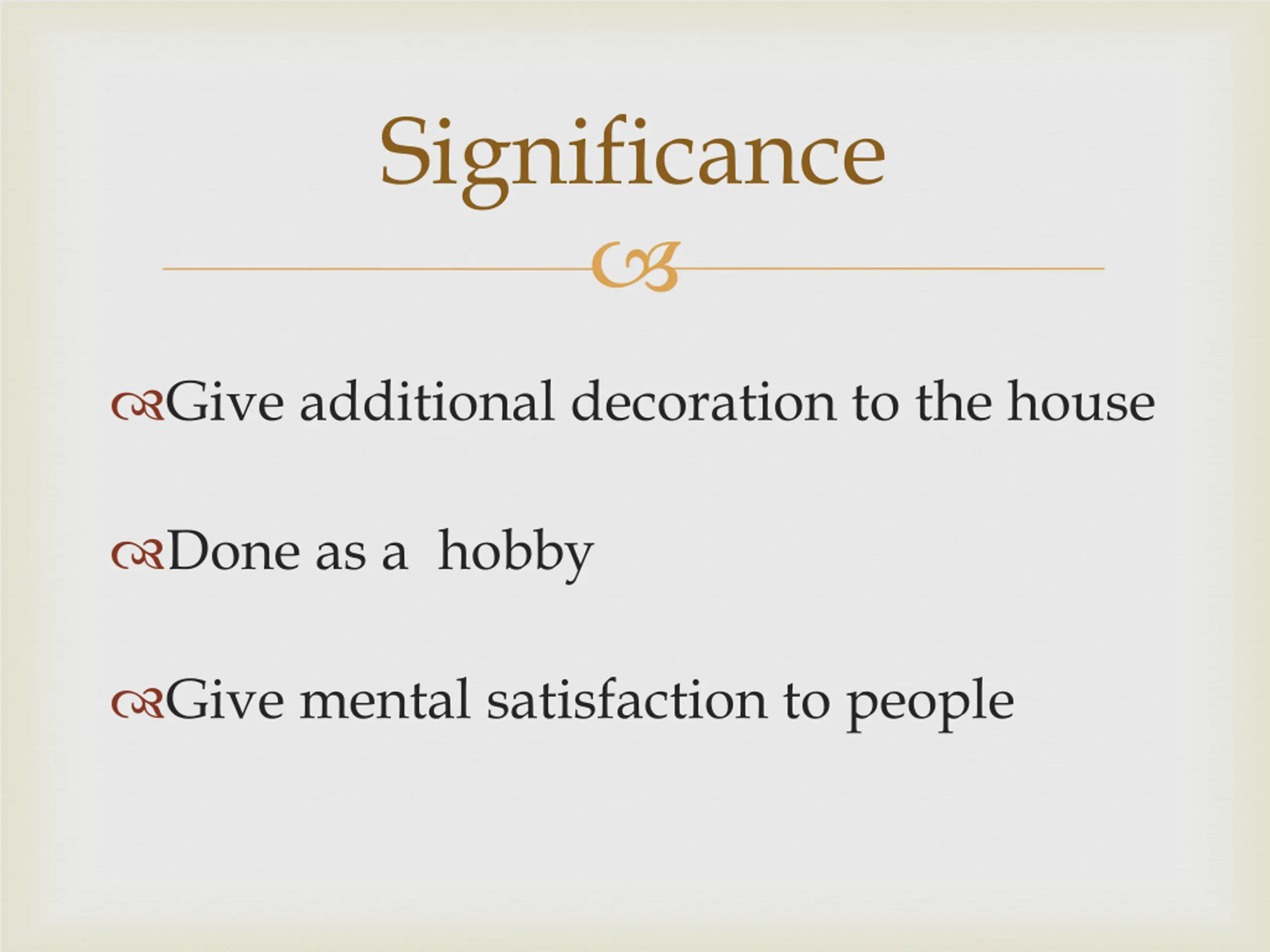 Significance Give additional decoration to the house Done as a hobby Give mental satisfaction to people