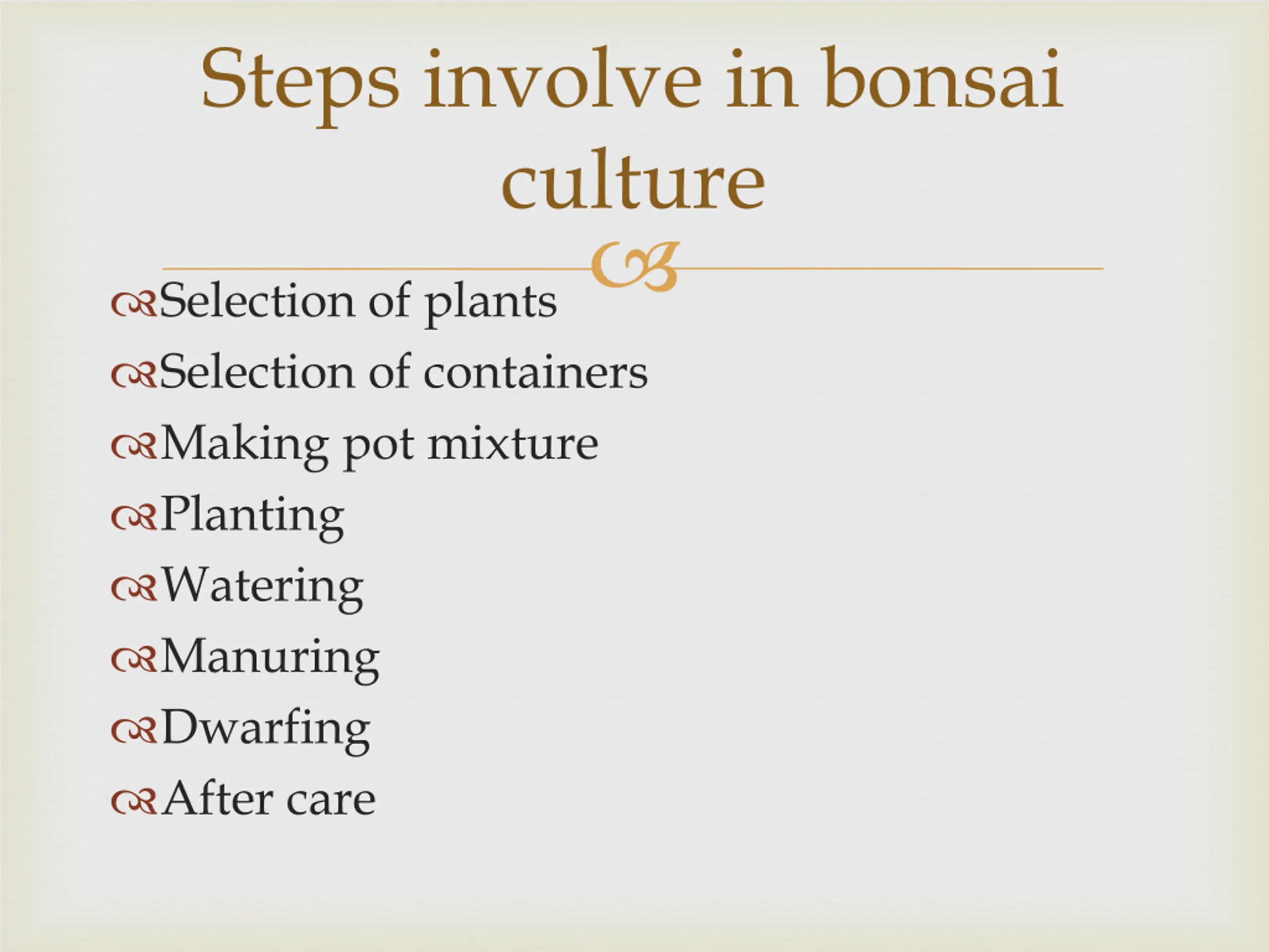 Steps involve in bonsai culture Selection of plants Selection of containers Making pot mixture Planting Watering Manuring Dwarfing After care