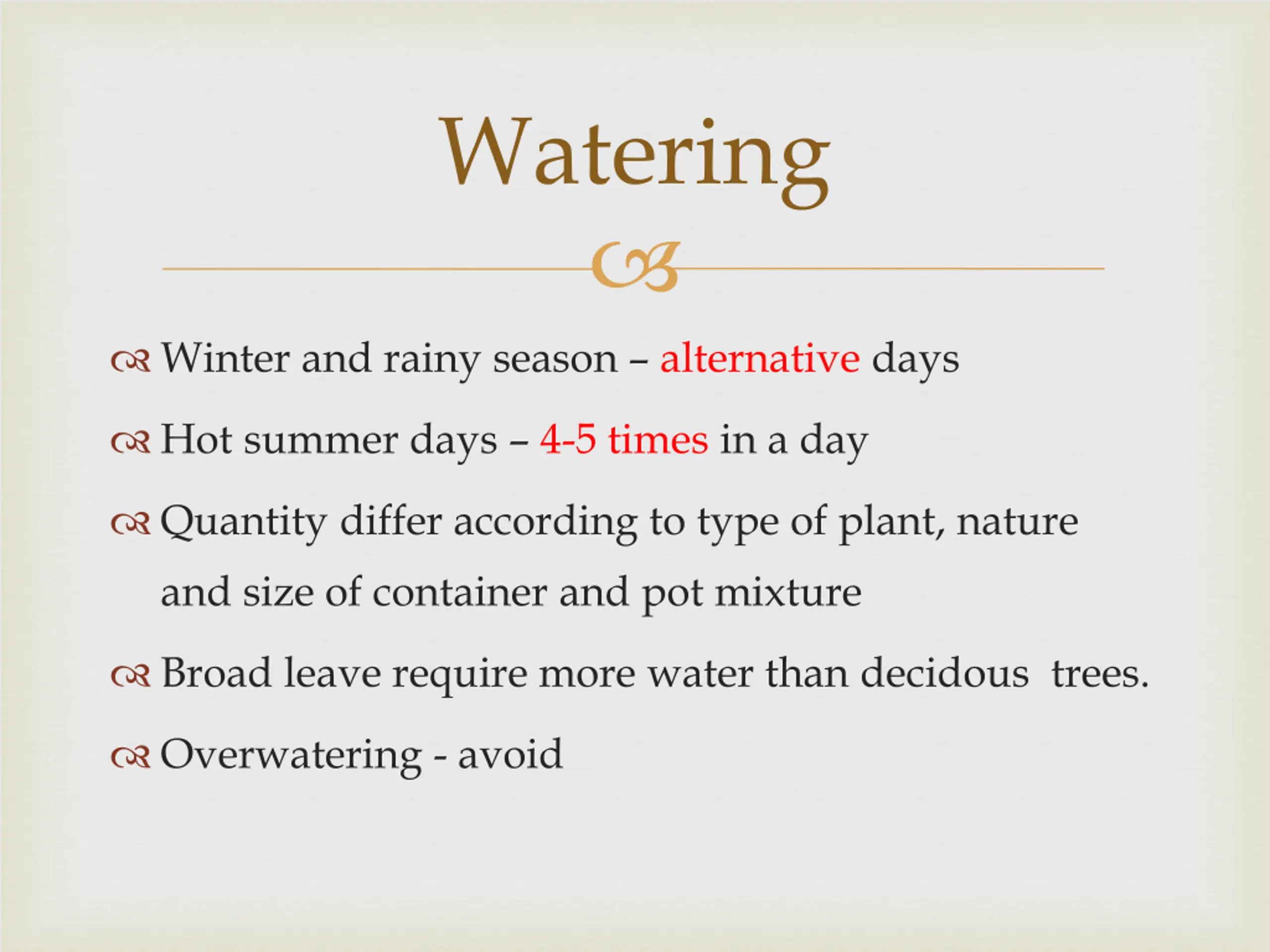 Watering Winter and rainy season alternative days Hot summer days 4-5 times in a day Quantity differ according to type of plant, nature and size of container and pot mixture Broad leave require more water than decidous trees. Overwatering - avoid