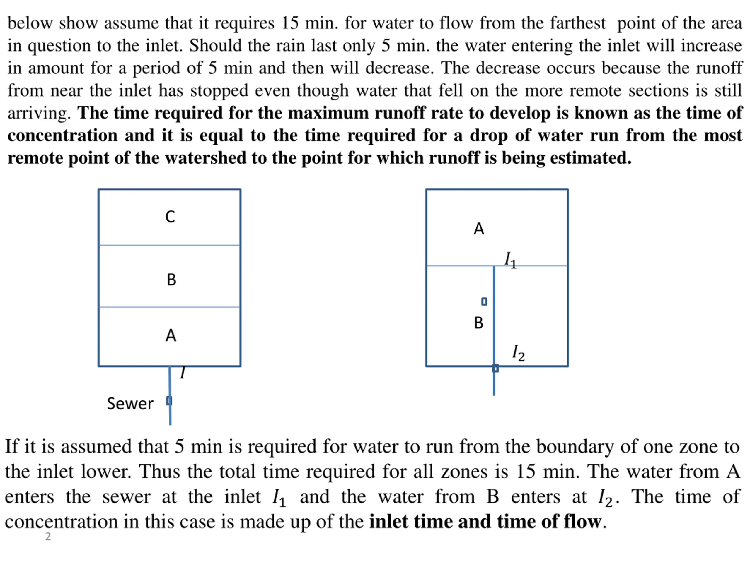 below show assume that it requires 15 min. for water to flow from the farthest point of the area in question to the inlet. Should the rain last only 5 min. the water entering the inlet will increase in amount for a period of 5 min and then will decrease. The decrease occurs because the runoff from near the inlet has stopped even though water that fell on the more remote sections is still arriving. The time required for the maximum runoff rate to develop is known as the time of concentration and it is equal to the time required for a drop of water run from the most remote point of the watershed to the point for which runoff is being estimated. C A ?1 B B ?2 ? Sewer If it is assumed that 5 min is required for water to run from the boundary of one zone to the inlet lower. Thus the total time required for all zones is 15 min. The water from A enters the sewer at the inlet ?1 and the water from B enters at ?2. The time of concentration in this case is made up of the inlet time and time of flow. 2