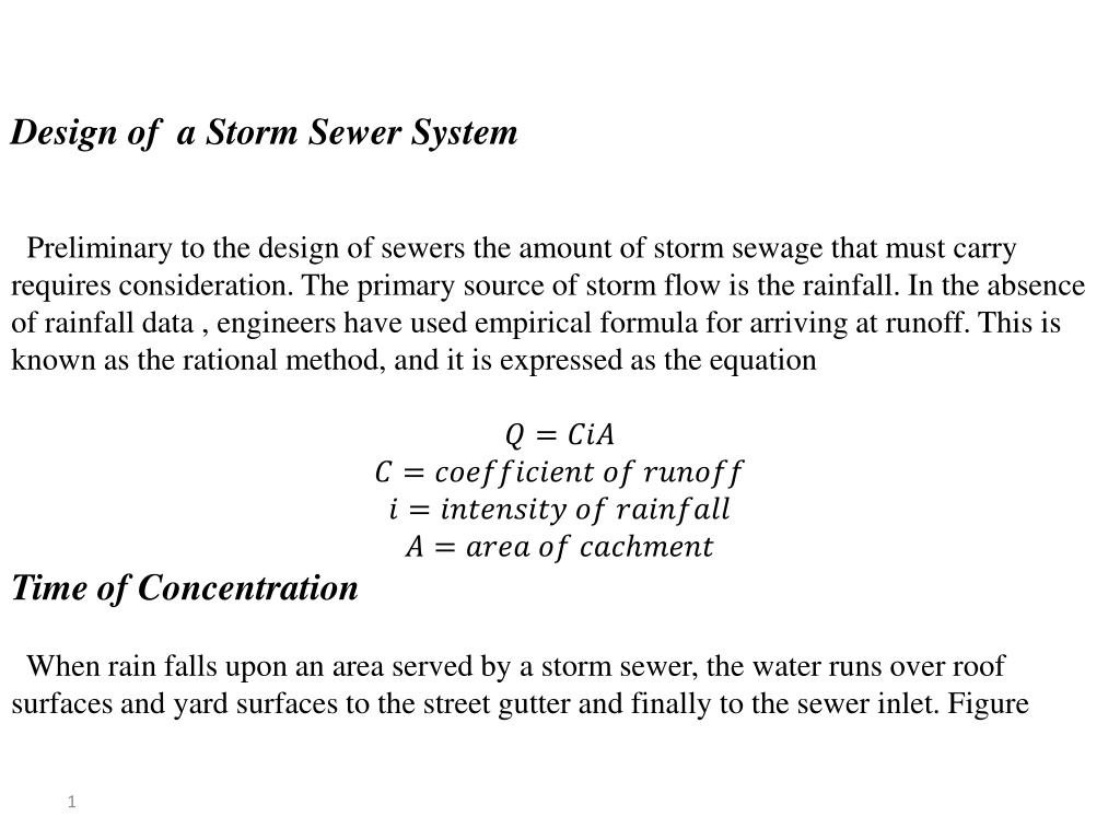Design of a Storm Sewer System Preliminary to the design of sewers the amount of storm sewage that must carry requires consideration. The primary source of storm flow is the rainfall. In the absence of rainfall data , engineers have used empirical formula for arriving at runoff. This is known as the rational method, and it is expressed as the equation ? = ??? ? = ??????????? ?? ?????? ? = ????????? ?? ???????? ? = ???? ?? ??? ???? Time of Concentration When rain falls upon an area served by a storm sewer, the water runs over roof surfaces and yard surfaces to the street gutter and finally to the sewer inlet. Figure 1