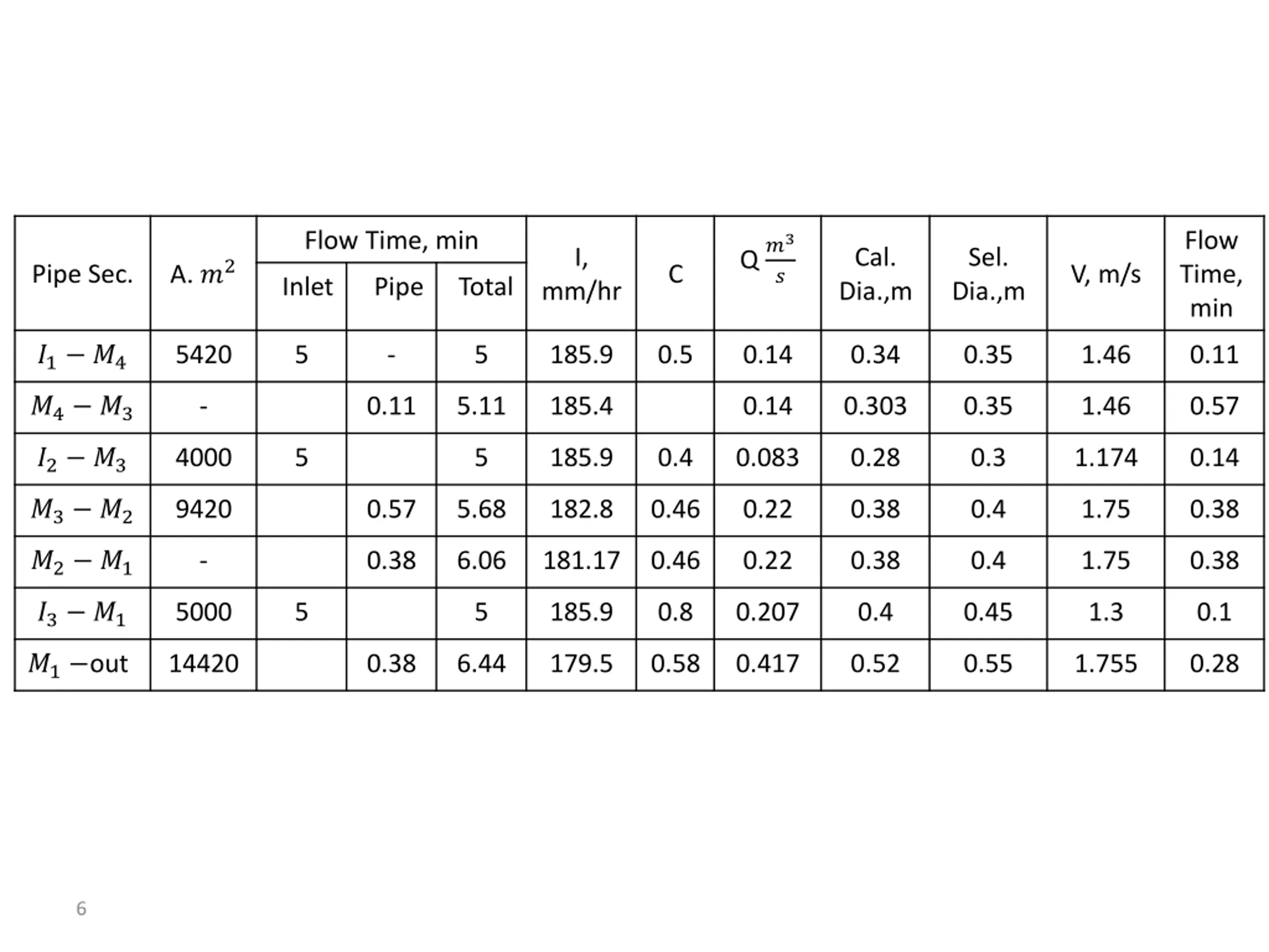 Flow Time, min Flow Time, min Q ?3 I, Cal. Dia.,m Sel. Dia.,m A. ?2 Pipe Sec. C V, m/s ? Inlet Pipe Total mm/hr ?1 ?4 5420 5 - 5 185.9 0.5 0.14 0.34 0.35 1.46 0.11 ?4 ?3 - 0.11 5.11 185.4 0.14 0.303 0.35 1.46 0.57 ?2 ?3 4000 5 5 185.9 0.4 0.083 0.28 0.3 1.174 0.14 ?3 ?2 9420 0.57 5.68 182.8 0.46 0.22 0.38 0.4 1.75 0.38 ?2 ?1 - 0.38 6.06 181.17 0.46 0.22 0.38 0.4 1.75 0.38 ?3 ?1 5000 5 5 185.9 0.8 0.207 0.4 0.45 1.3 0.1 ?1 out 14420 0.38 6.44 179.5 0.58 0.417 0.52 0.55 1.755 0.28 6