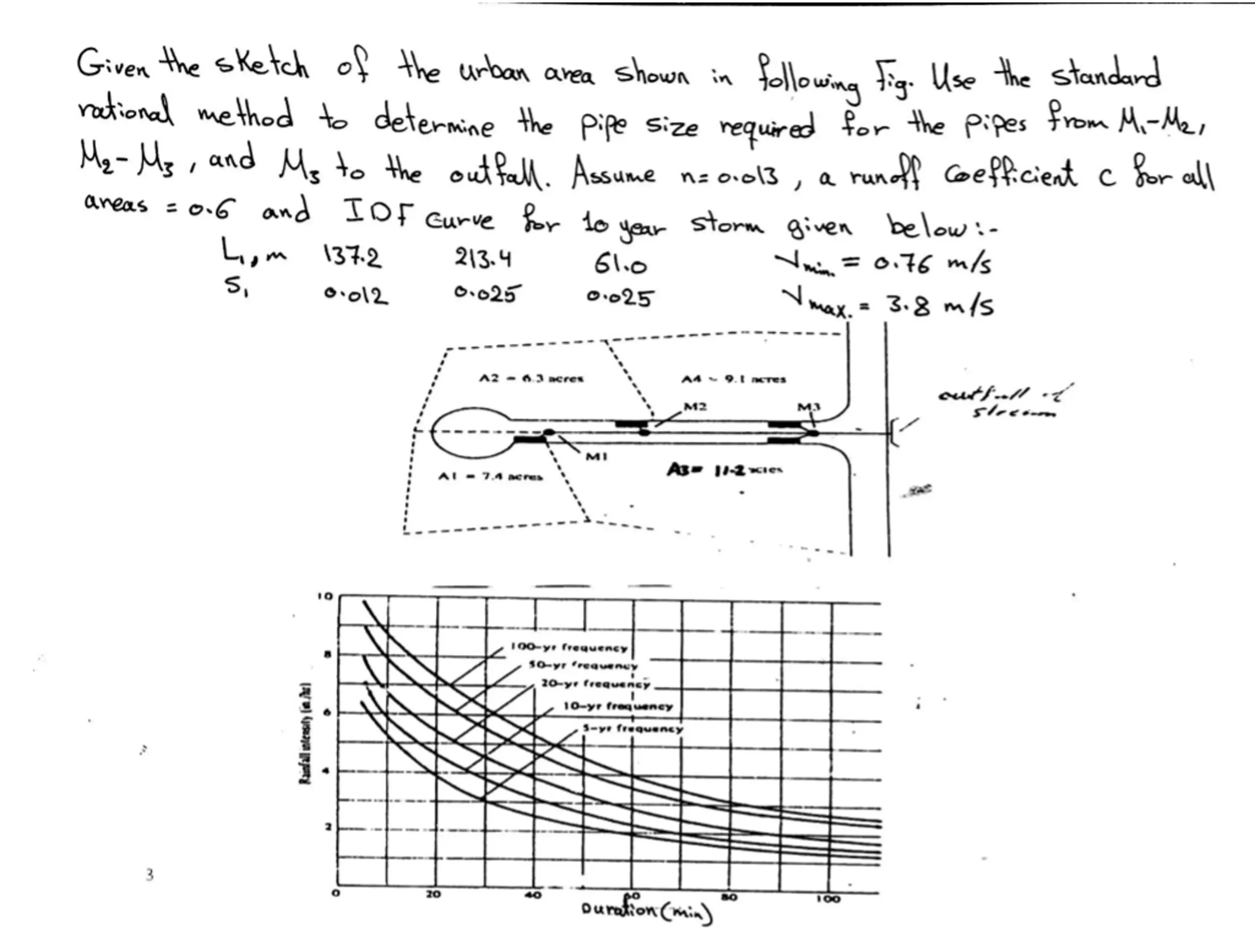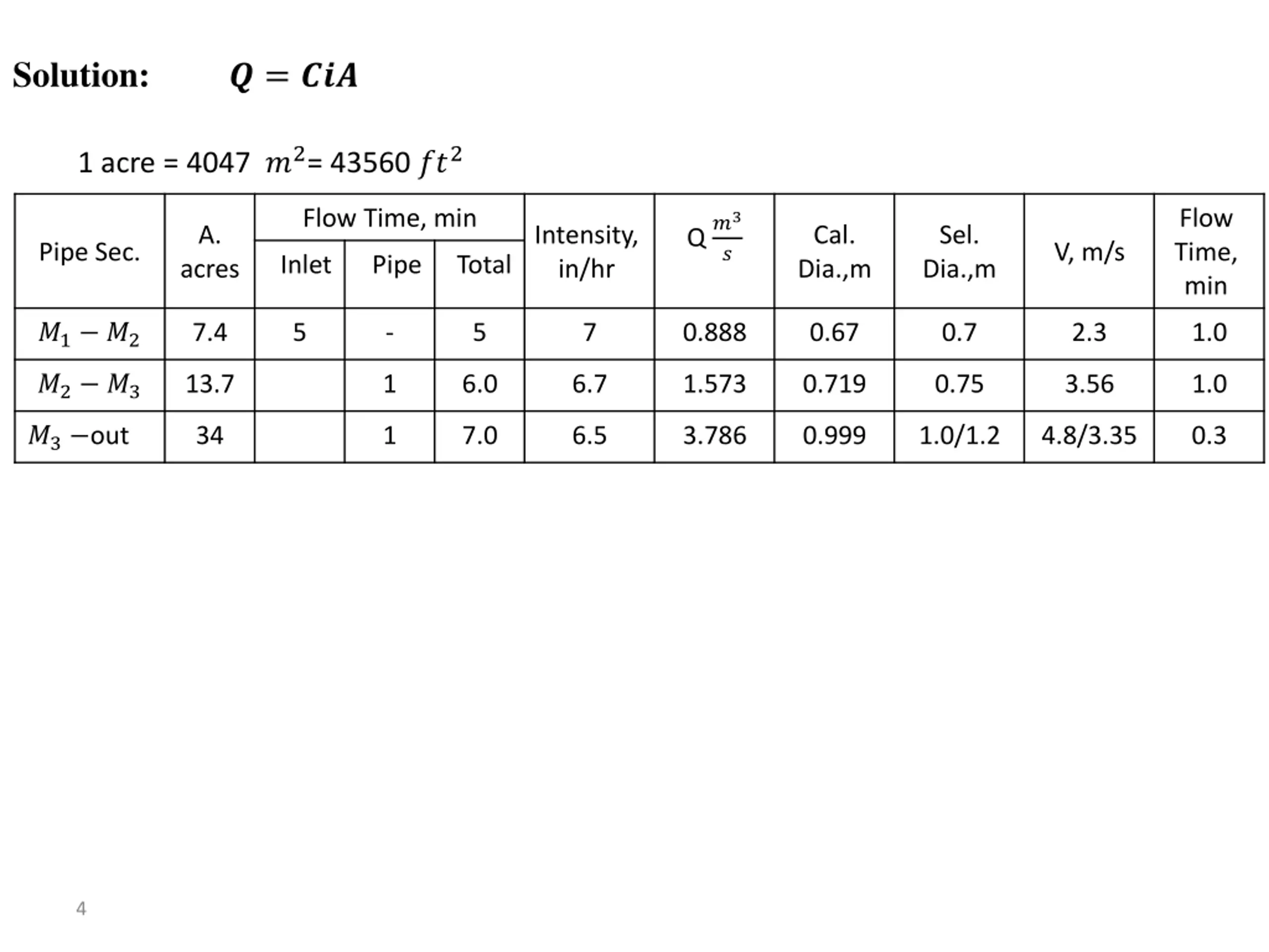 Solution: ? = ??? 1 acre = 4047 ?2= 43560 ??2 Flow Time, min Flow Time, min Q ?3 A. Intensity, in/hr Cal. Dia.,m Sel. Dia.,m Pipe Sec. V, m/s ? Inlet Pipe Total acres ?1 ?2 7.4 5 - 5 7 0.888 0.67 0.7 2.3 1.0 ?2 ?3 13.7 1 6.0 6.7 1.573 0.719 0.75 3.56 1.0 ?3 out 34 1 7.0 6.5 3.786 0.999 1.0/1.2 4.8/3.35 0.3 4