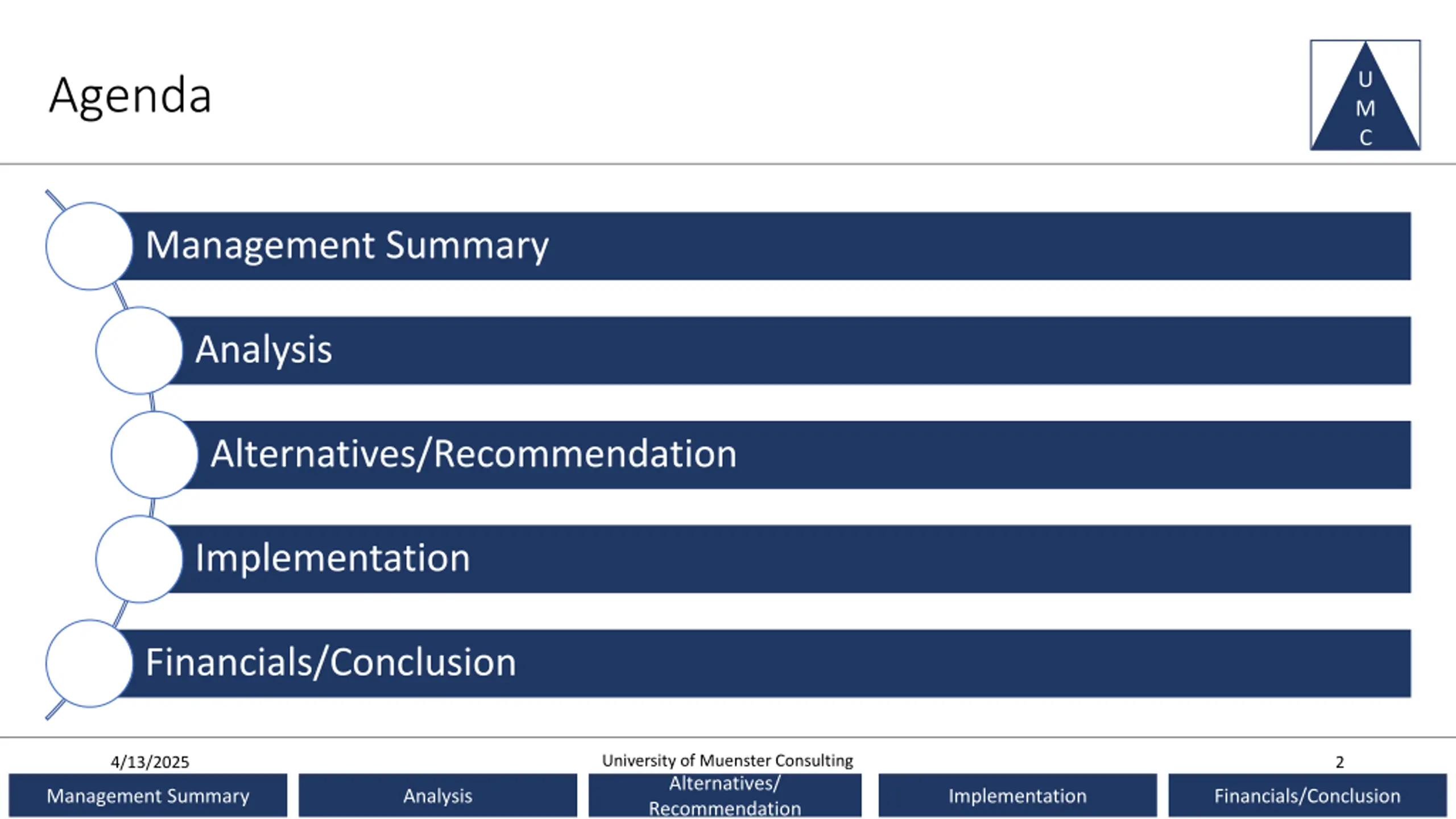 U M C Agenda Management Summary Analysis Alternatives/Recommendation Implementation Financials/Conclusion University of Muenster Consulting 4/13/2025 2 Alternatives/ Recommendation Management Summary Analysis Implementation Financials/Conclusion