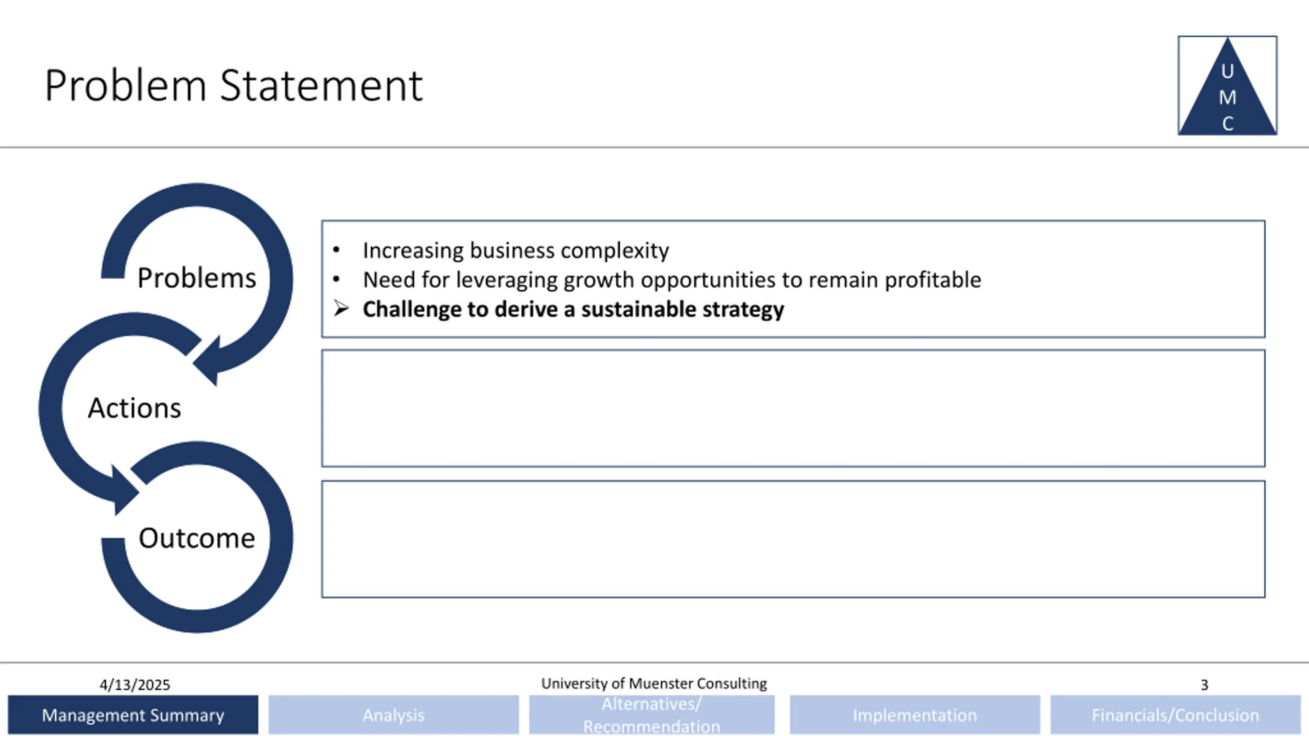 U M C Problem Statement Challenge to derive a sustainable strategy Increasing business complexity Need for leveraging growth opportunities to remain profitable Problems Actions Outcome University of Muenster Consulting 4/13/2025 3 Alternatives/ Recommendation Management Summary Analysis Implementation Financials/Conclusion
