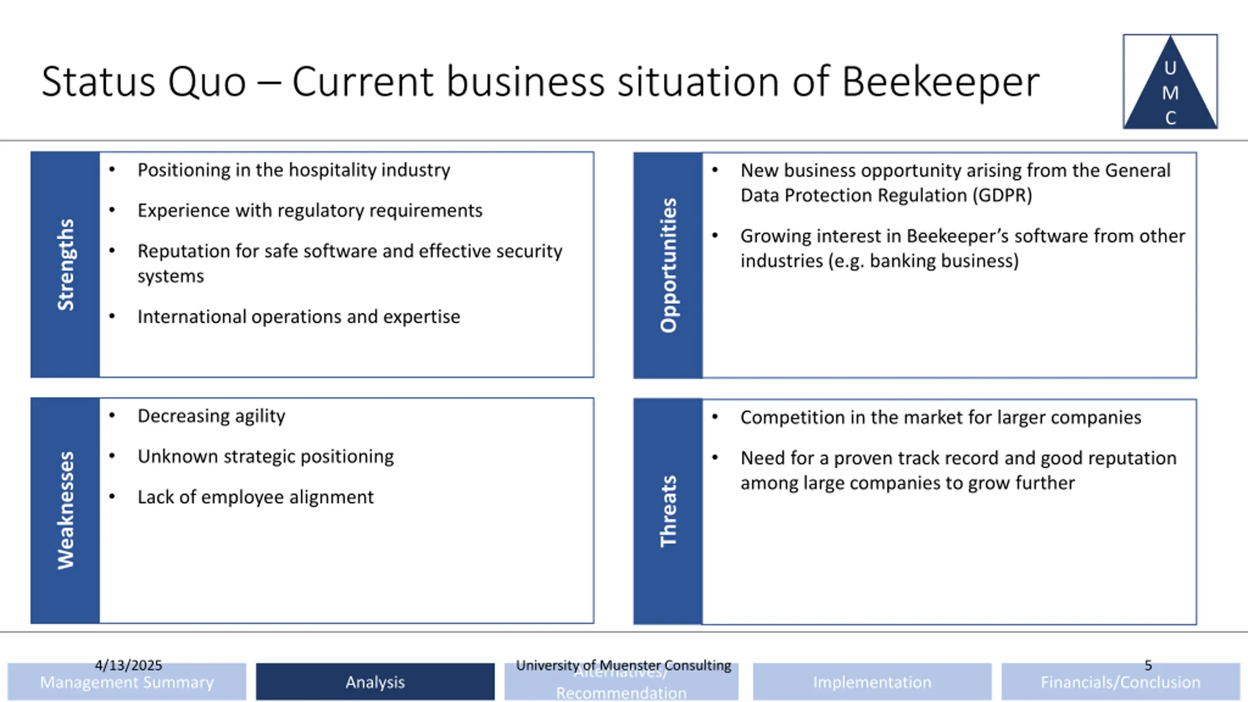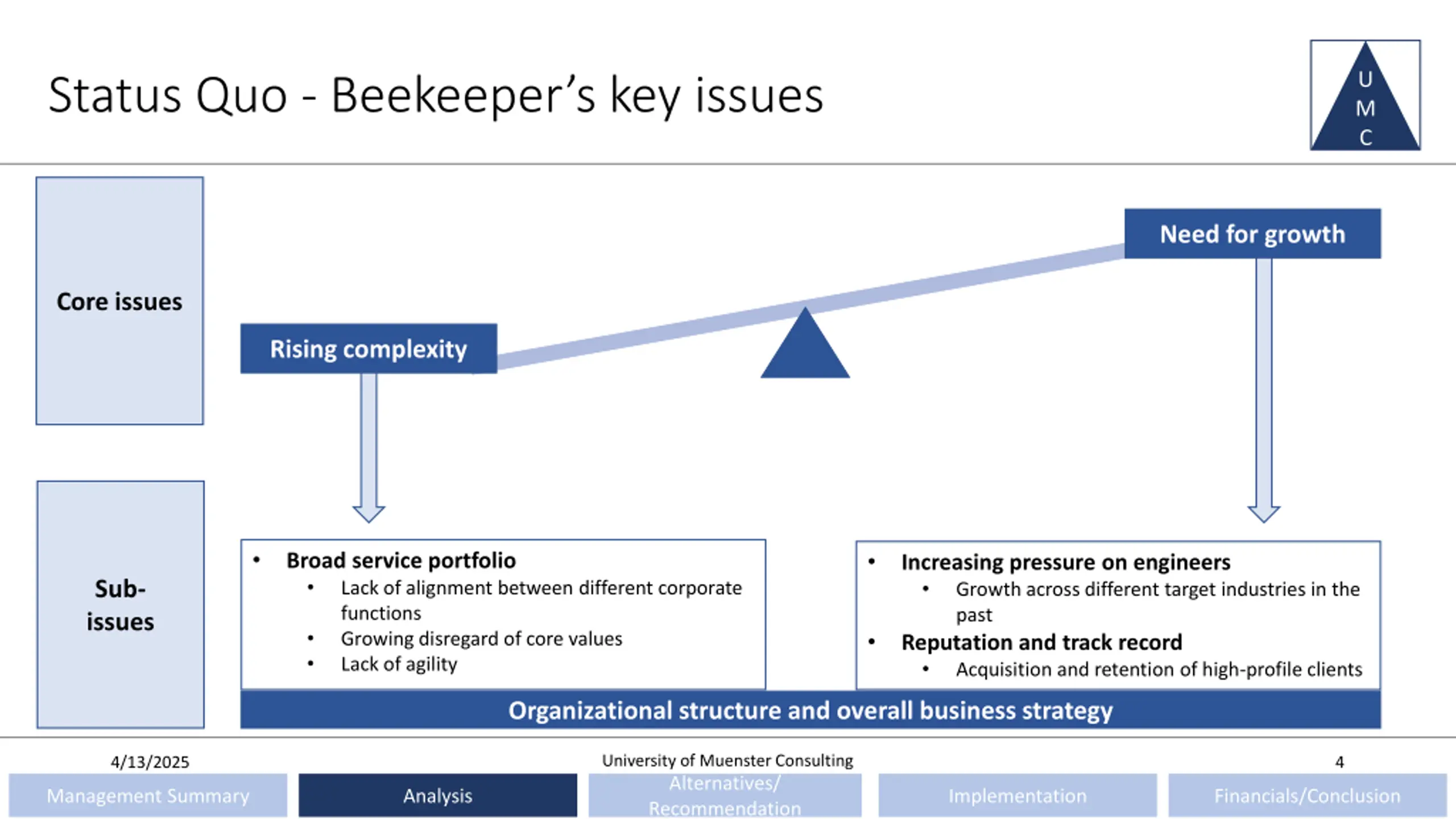 U M C Status Quo - Beekeeper s key issues Need for growth Core issues Rising complexity Broad service portfolio Lack of alignment between different corporate functions Growing disregard of core values Lack of agility Increasing pressure on engineers Growth across different target industries in the past Reputation and track record Acquisition and retention of high-profile clients Sub- issues Organizational structure and overall business strategy University of Muenster Consulting 4/13/2025 4 Alternatives/ Recommendation Management Summary Analysis Implementation Financials/Conclusion