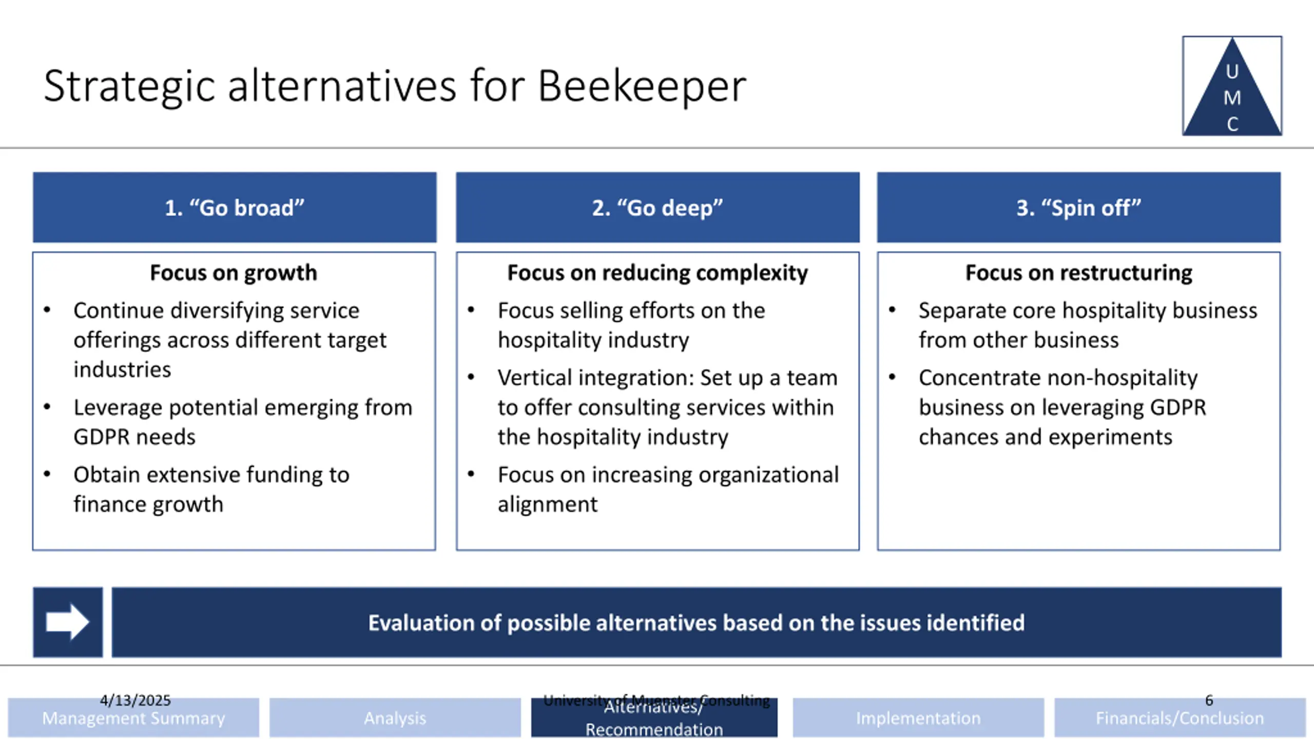 U M C Strategic alternatives for Beekeeper 1. Go broad 2. Go deep 3. Spin off Focus on growth Focus on reducing complexity Focus on restructuring Continue diversifying service offerings across different target industries Focus selling efforts on the hospitality industry Separate core hospitality business from other business Vertical integration: Set up a team to offer consulting services within the hospitality industry Concentrate non-hospitality business on leveraging GDPR chances and experiments Leverage potential emerging from GDPR needs Obtain extensive funding to finance growth Focus on increasing organizational alignment Evaluation of possible alternatives based on the issues identified 4/13/2025 University of Muenster Consulting 6 Alternatives/ Recommendation Management Summary Analysis Implementation Financials/Conclusion