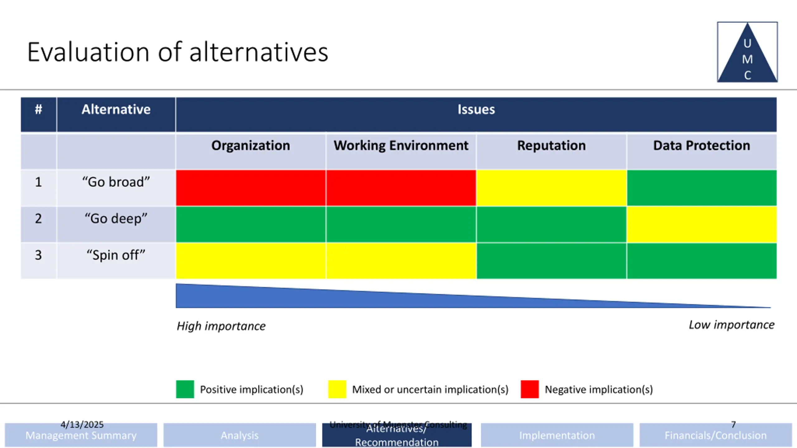 U M C Evaluation of alternatives # Alternative Issues Organization Working Environment Reputation Data Protection 1 Go broad 2 Go deep 3 Spin off Low importance High importance Positive implication(s) Mixed or uncertain implication(s) Negative implication(s) 4/13/2025 University of Muenster Consulting 7 Alternatives/ Recommendation Management Summary Analysis Implementation Financials/Conclusion