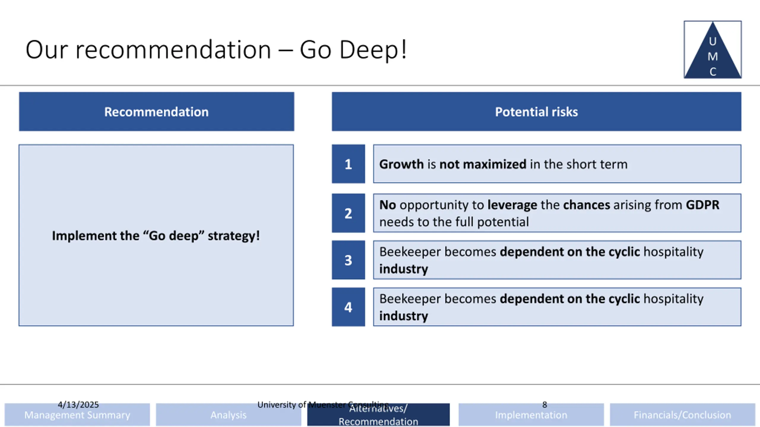 U M C Our recommendation Go Deep! Recommendation Potential risks 1 Growth is not maximized in the short term No opportunity to leverage the chances arising from GDPR needs to the full potential 2 Implement the Go deep strategy! Beekeeper becomes dependent on the cyclic hospitality industry 3 Beekeeper becomes dependent on the cyclic hospitality industry 4 4/13/2025 University of Muenster Consulting 8 Alternatives/ Recommendation Management Summary Analysis Implementation Financials/Conclusion