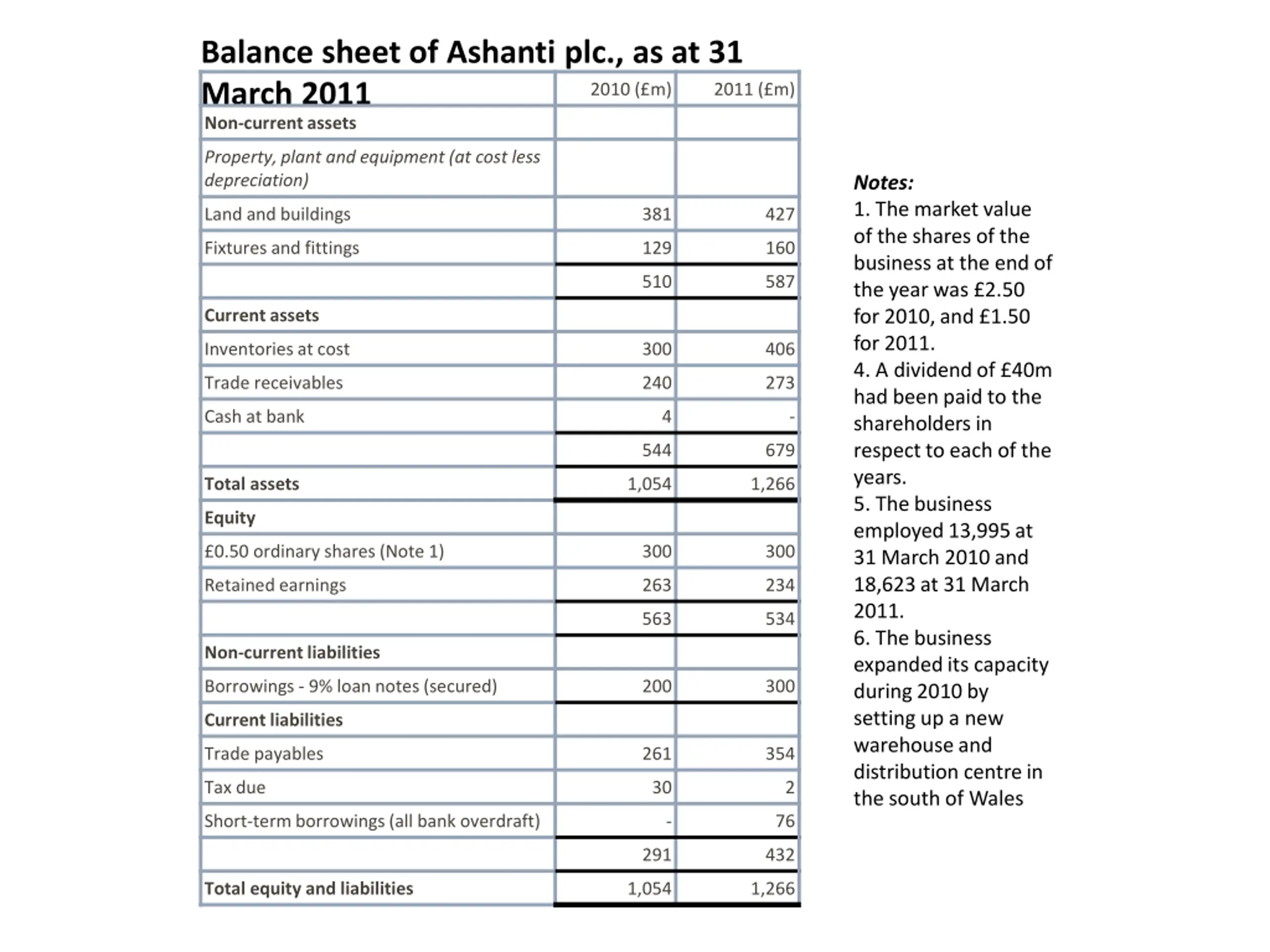 Balance sheet of Ashanti plc., as at 31 March 2011 Non-current assets 2010 ( m) 2011 ( m) Property, plant and equipment (at cost less depreciation) Notes: 1. The market value of the shares of the business at the end of the year was 2.50 for 2010, and 1.50 for 2011. 4. A dividend of 40m had been paid to the shareholders in respect to each of the years. 5. The business employed 13,995 at 31 March 2010 and 18,623 at 31 March 2011. 6. The business expanded its capacity during 2010 by setting up a new warehouse and distribution centre in the south of Wales Land and buildings 381 427 Fixtures and fittings 129 160 510 587 Current assets Inventories at cost 300 406 Trade receivables 240 273 Cash at bank 4 - 544 679 Total assets 1,054 1,266 Equity 0.50 ordinary shares (Note 1) 300 300 Retained earnings 263 234 563 534 Non-current liabilities Borrowings - 9% loan notes (secured) 200 300 Current liabilities Trade payables 261 354 Tax due 30 2 Short-term borrowings (all bank overdraft) - 76 291 432 Total equity and liabilities 1,054 1,266