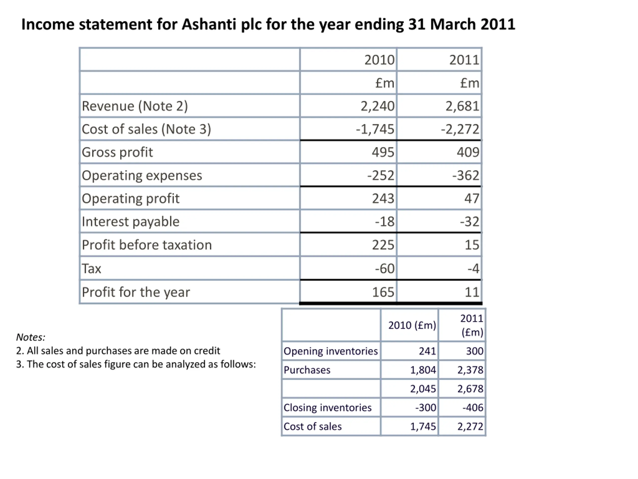 Income statement for Ashanti plc for the year ending 31 March 2011 2010 2011 m m Revenue (Note 2) 2,240 2,681 Cost of sales (Note 3) -1,745 -2,272 Gross profit 495 409 Operating expenses -252 -362 Operating profit 243 47 Interest payable -18 -32 Profit before taxation 225 15 Tax -60 -4 Profit for the year 165 11 2011 ( m) 2010 ( m) Notes: 2. All sales and purchases are made on credit 3. The cost of sales figure can be analyzed as follows: Opening inventories 241 300 Purchases 1,804 2,378 2,045 2,678 Closing inventories -300 -406 Cost of sales 1,745 2,272