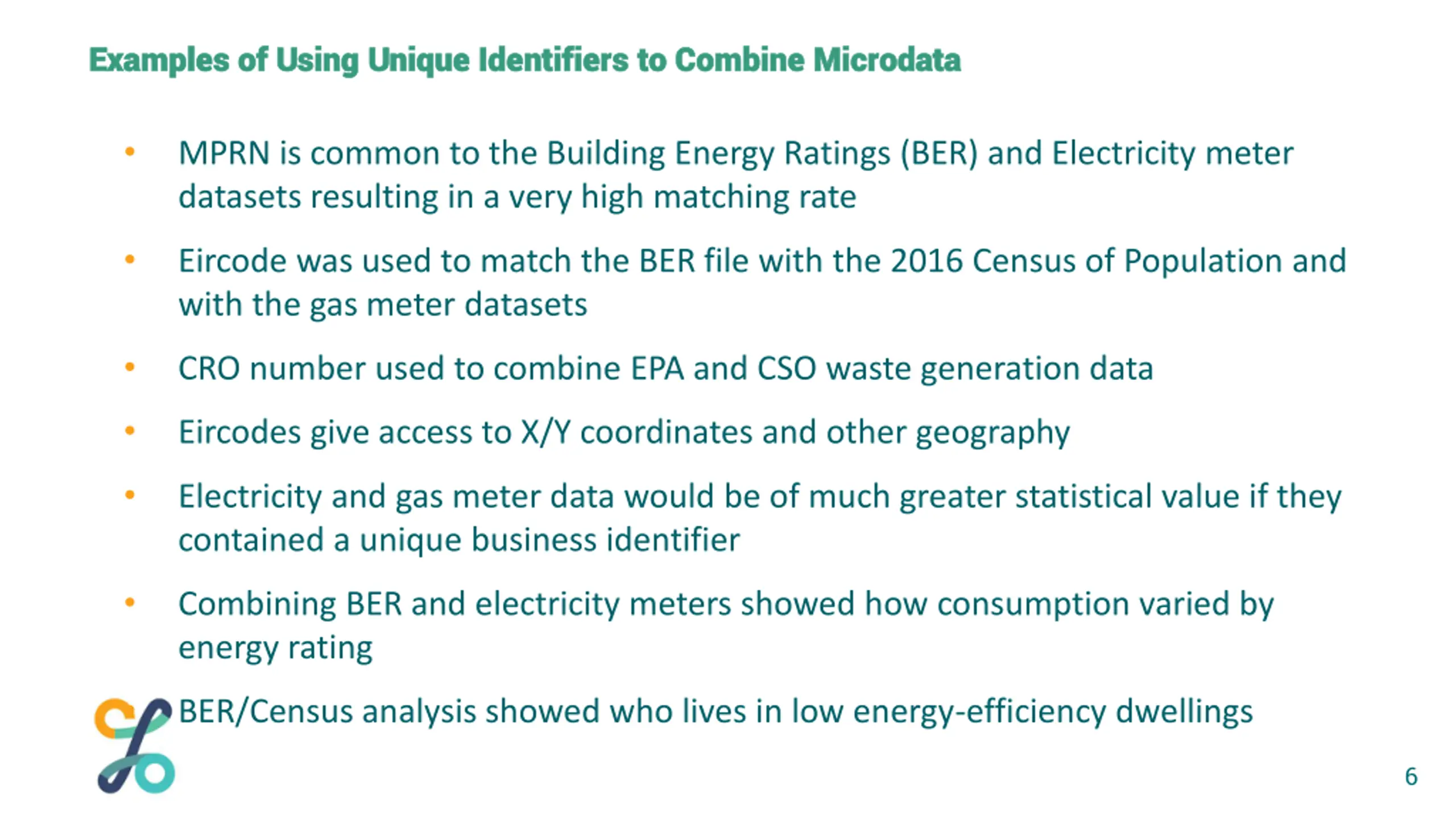 Examples of Using Unique Identifiers to Combine Microdata Examples of Using Unique Identifiers to Combine Microdata MPRN is common to the Building Energy Ratings (BER) and Electricity meter datasets resulting in a very high matching rate Eircode was used to match the BER file with the 2016 Census of Population and with the gas meter datasets CRO number used to combine EPA and CSO waste generation data Eircodes give access to X/Y coordinates and other geography Electricity and gas meter data would be of much greater statistical value if they contained a unique business identifier Combining BER and electricity meters showed how consumption varied by energy rating BER/Census analysis showed who lives in low energy-efficiency dwellings 6