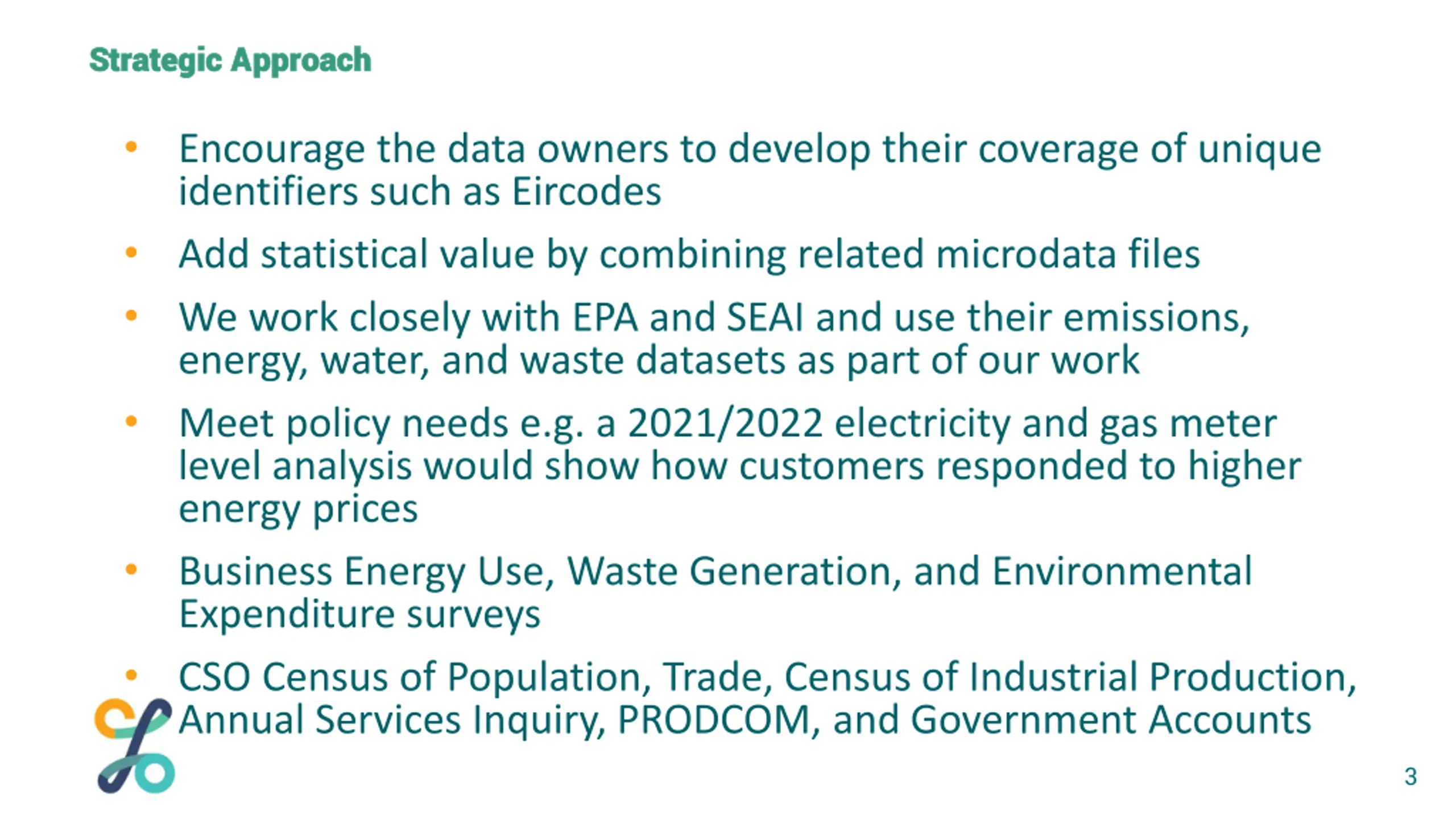 Strategic Approach Strategic Approach Encourage the data owners to develop their coverage of unique identifiers such as Eircodes Add statistical value by combining related microdata files We work closely with EPA and SEAI and use their emissions, energy, water, and waste datasets as part of our work Meet policy needs e.g. a 2021/2022 electricity and gas meter level analysis would show how customers responded to higher energy prices Business Energy Use, Waste Generation, and Environmental Expenditure surveys CSO Census of Population, Trade, Census of Industrial Production, Annual Services Inquiry, PRODCOM, and Government Accounts 3
