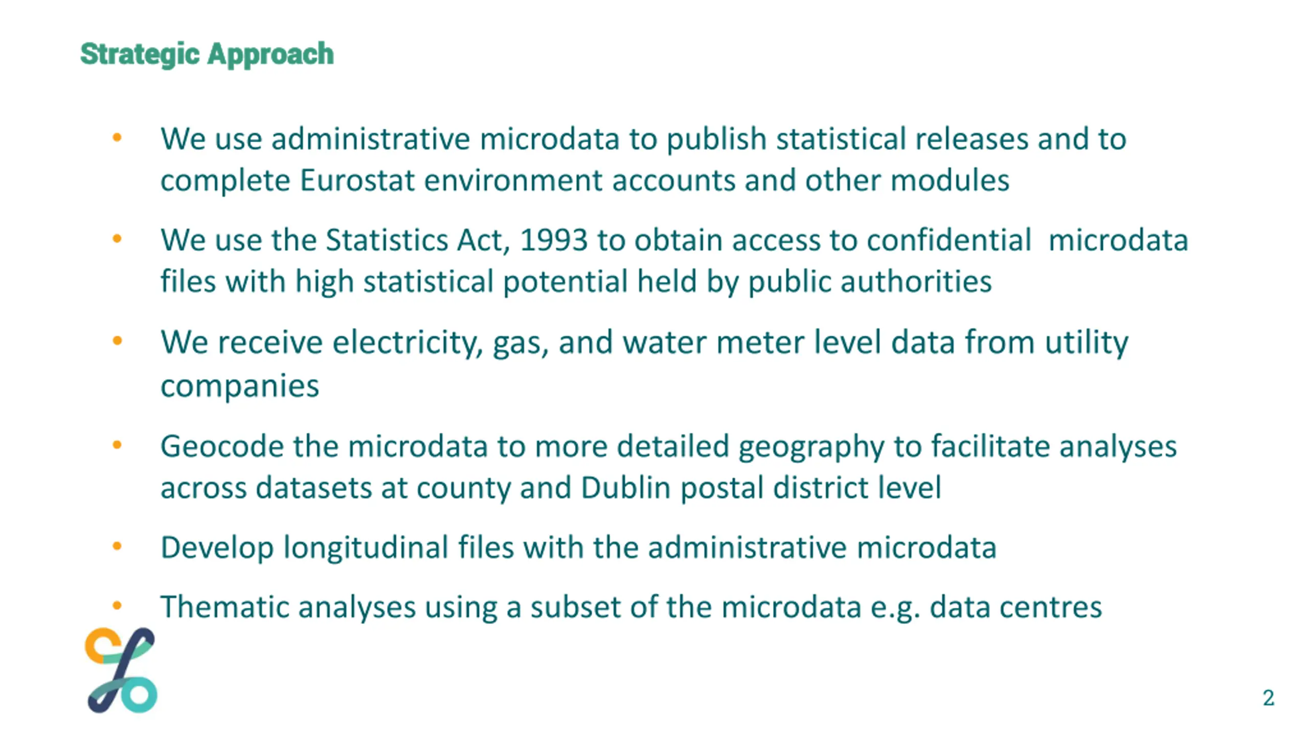 Strategic Approach Strategic Approach We use administrative microdata to publish statistical releases and to complete Eurostat environment accounts and other modules We use the Statistics Act, 1993 to obtain access to confidential microdata files with high statistical potential held by public authorities We receive electricity, gas, and water meter level data from utility companies Geocode the microdata to more detailed geography to facilitate analyses across datasets at county and Dublin postal district level Develop longitudinal files with the administrative microdata Thematic analyses using a subset of the microdata e.g. data centres 2
