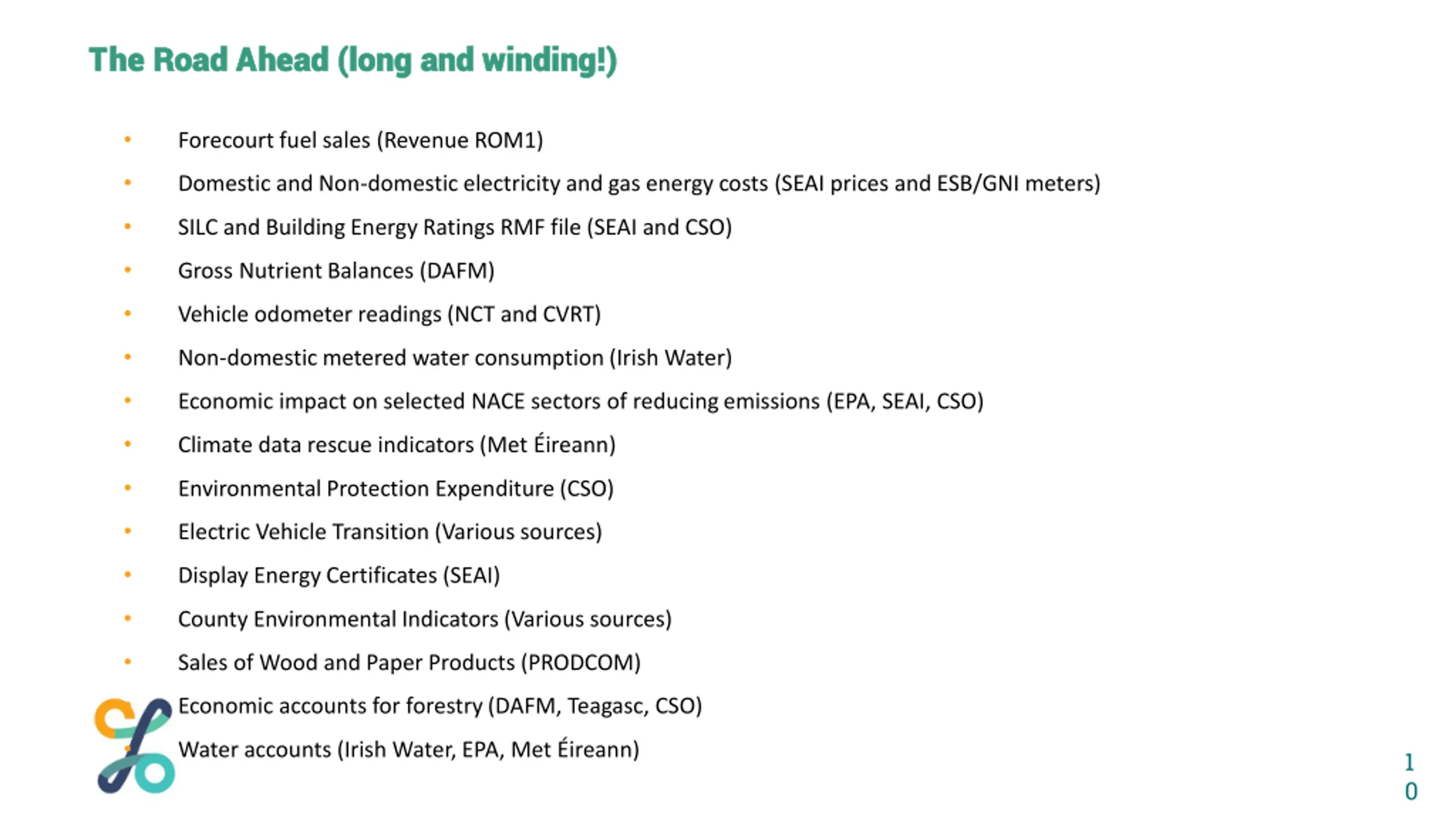 The Road Ahead (long and winding!) The Road Ahead (long and winding!) Forecourt fuel sales (Revenue ROM1) Domestic and Non-domestic electricity and gas energy costs (SEAI prices and ESB/GNI meters) SILC and Building Energy Ratings RMF file (SEAI and CSO) Gross NutrientBalances (DAFM) Vehicle odometer readings (NCT and CVRT) Non-domestic metered water consumption (Irish Water) Economic impact on selected NACE sectors of reducing emissions (EPA, SEAI, CSO) Climate data rescue indicators (Met ireann) Environmental Protection Expenditure (CSO) Electric Vehicle Transition (Various sources) Display Energy Certificates (SEAI) County Environmental Indicators (Various sources) Sales of Wood and Paper Products (PRODCOM) Economic accounts for forestry (DAFM, Teagasc, CSO) Water accounts (Irish Water, EPA, Met ireann) 1 0