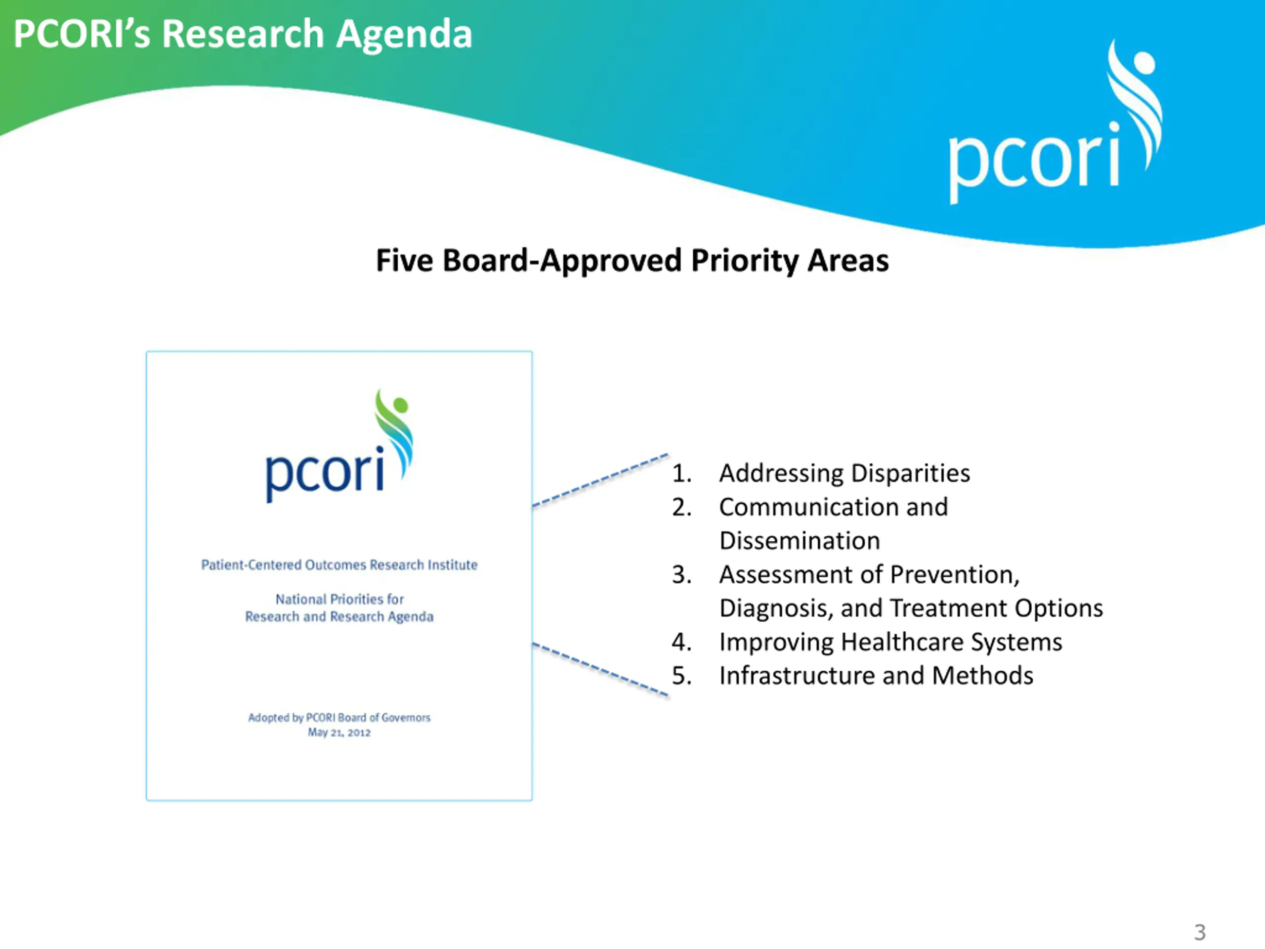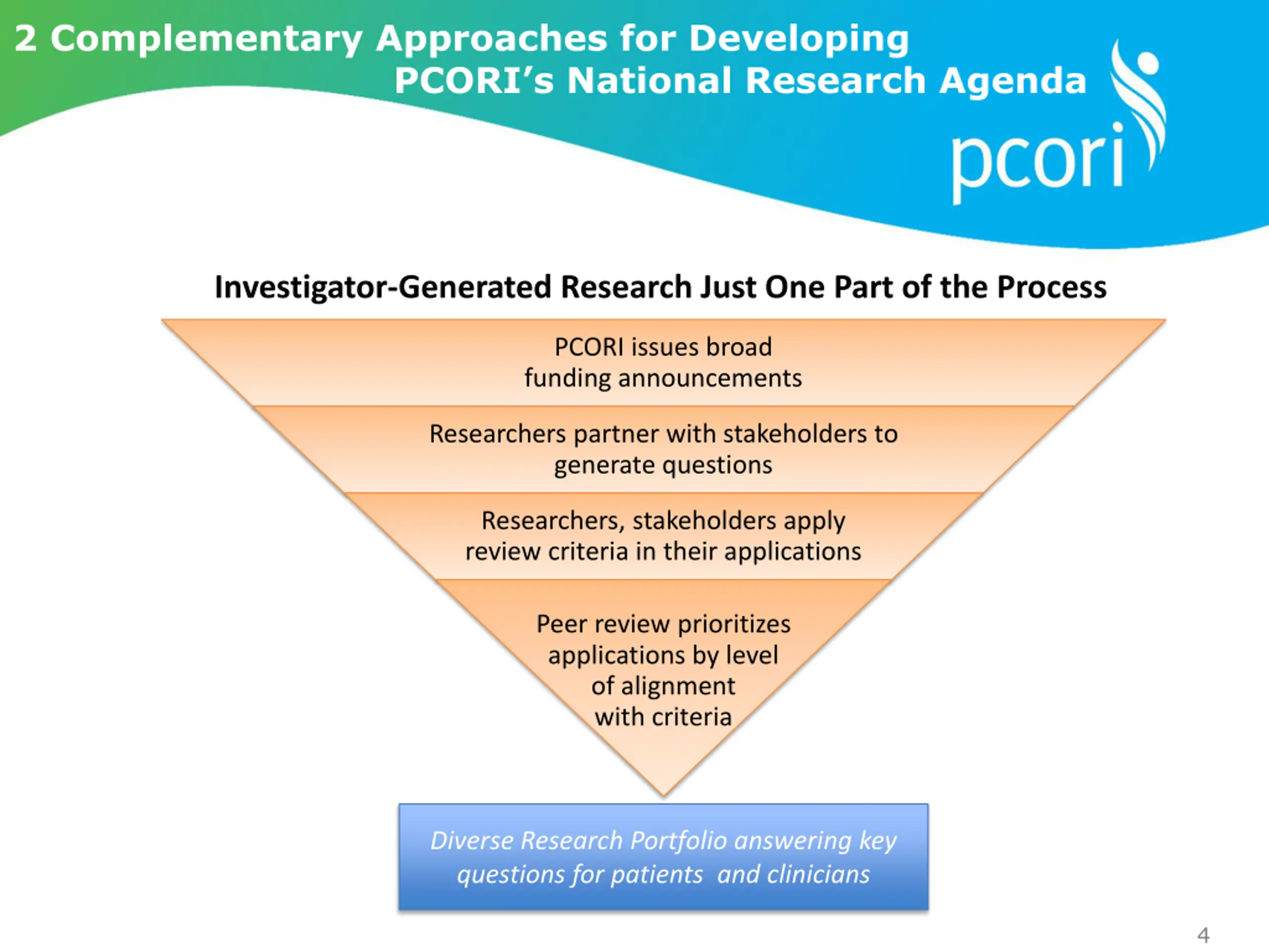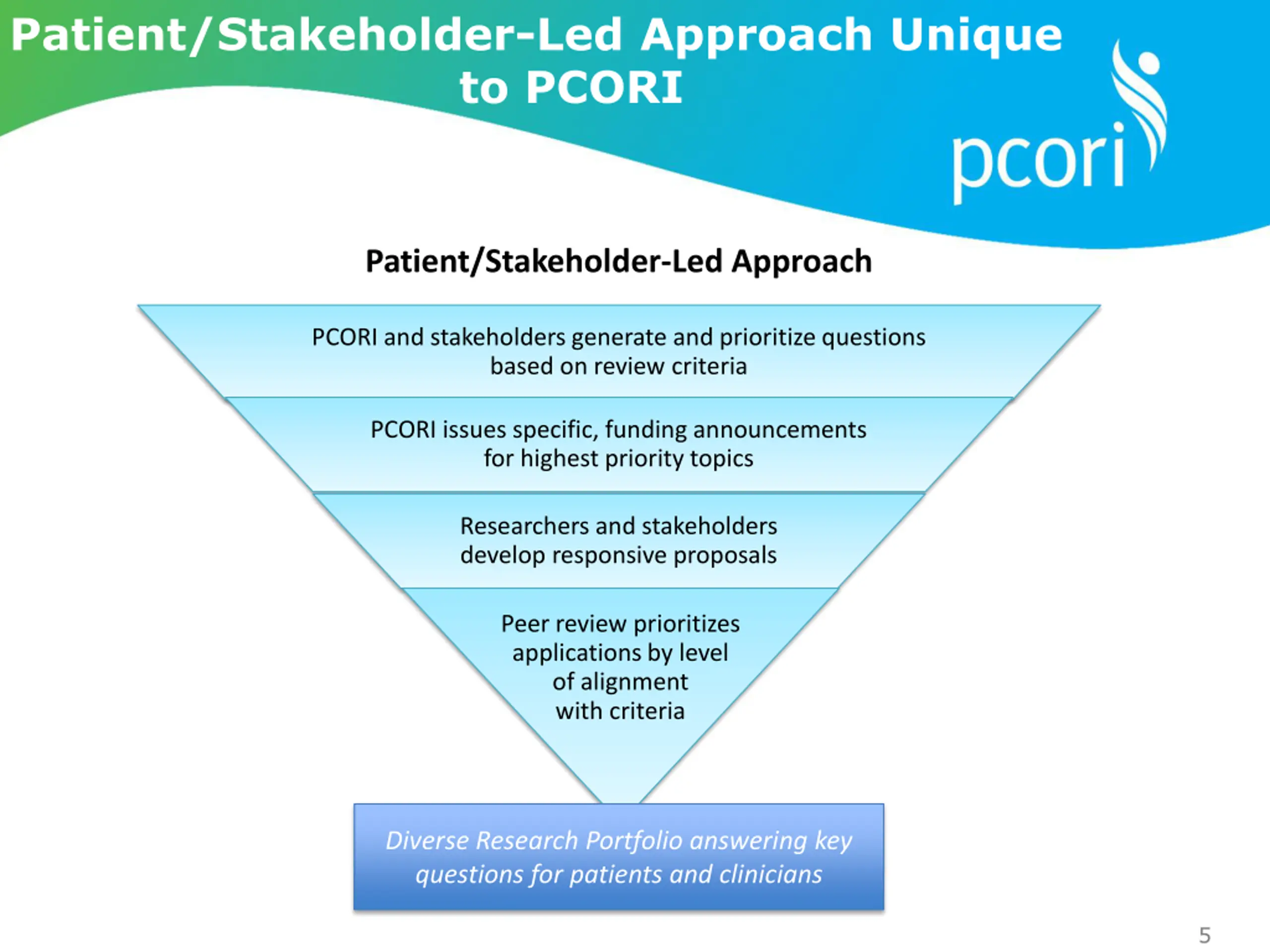 2 Complementary Approaches for Developing PCORI s National Research Agenda Investigator-Generated Research Just One Part of the Process PCORI issues broad funding announcements Researchers partner with stakeholders to generate questions Researchers, stakeholders apply review criteria in their applications Peer review prioritizes applications by level of alignment with criteria Diverse Research Portfolio answering key questions for patients and clinicians 4