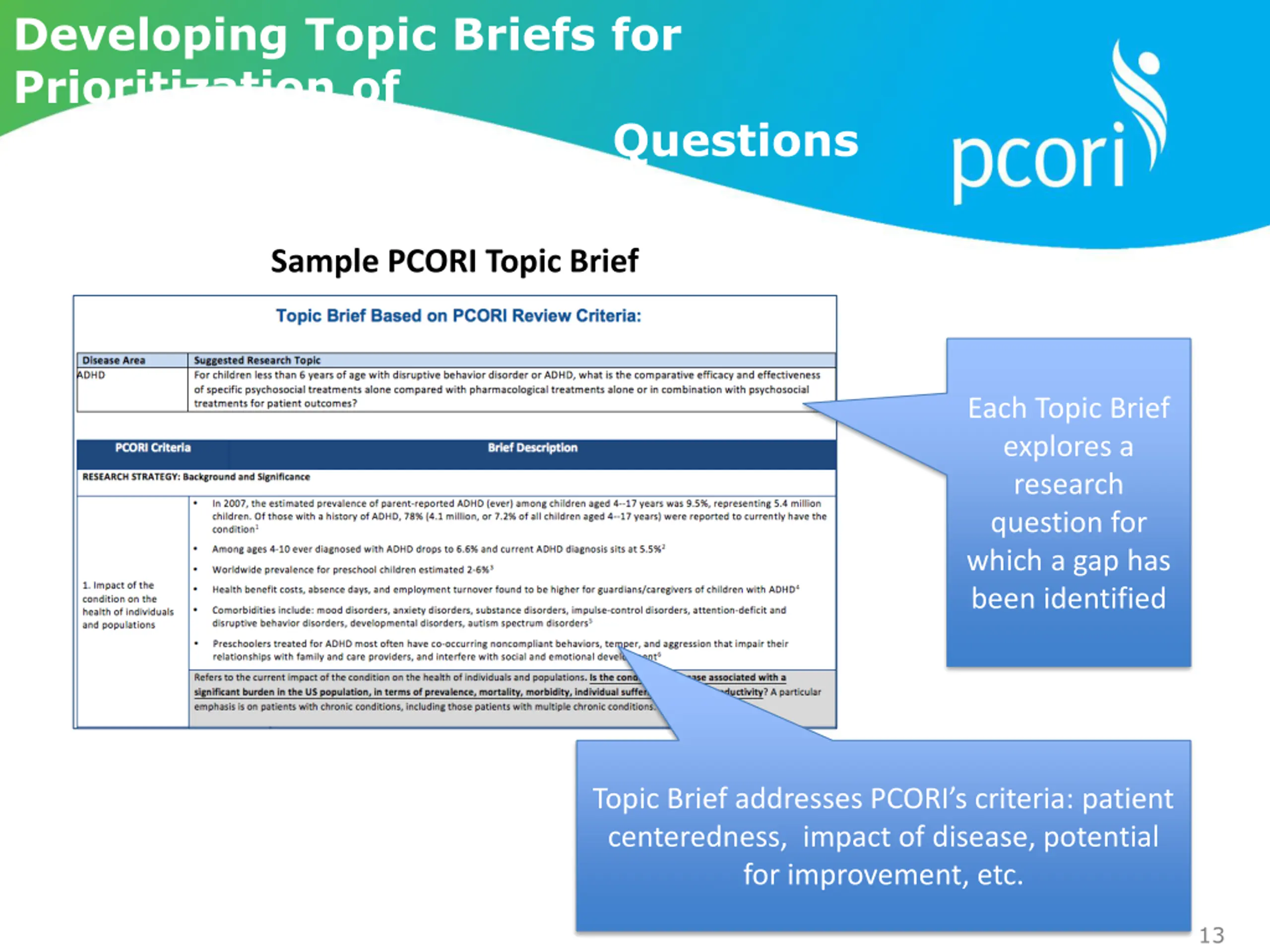 Developing Topic Briefs for Prioritization of Questions Sample PCORI Topic Brief Each Topic Brief explores a research question for which a gap has been identified Topic Brief addresses PCORI s criteria: patient centeredness, impact of disease, potential for improvement, etc. 13