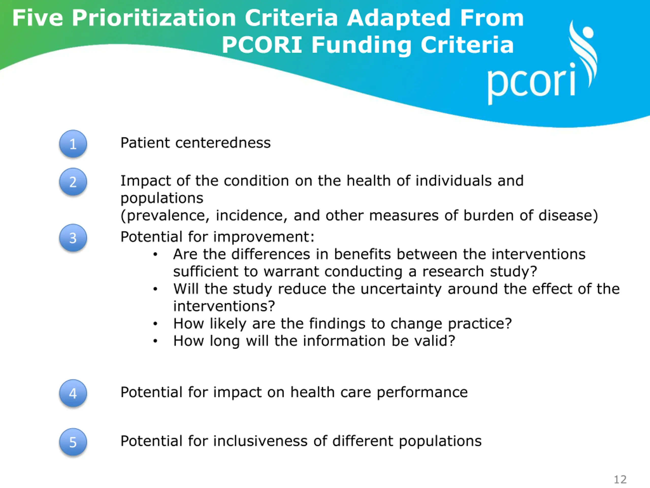 Five Prioritization Criteria Adapted From PCORI Funding Criteria Patient centeredness 1 Impact of the condition on the health of individuals and populations (prevalence, incidence, and other measures of burden of disease) Potential for improvement: Are the differences in benefits between the interventions sufficient to warrant conducting a research study? Will the study reduce the uncertainty around the effect of the interventions? How likely are the findings to change practice? How long will the information be valid? 2 3 Potential for impact on health care performance 4 Potential for inclusiveness of different populations 5 12
