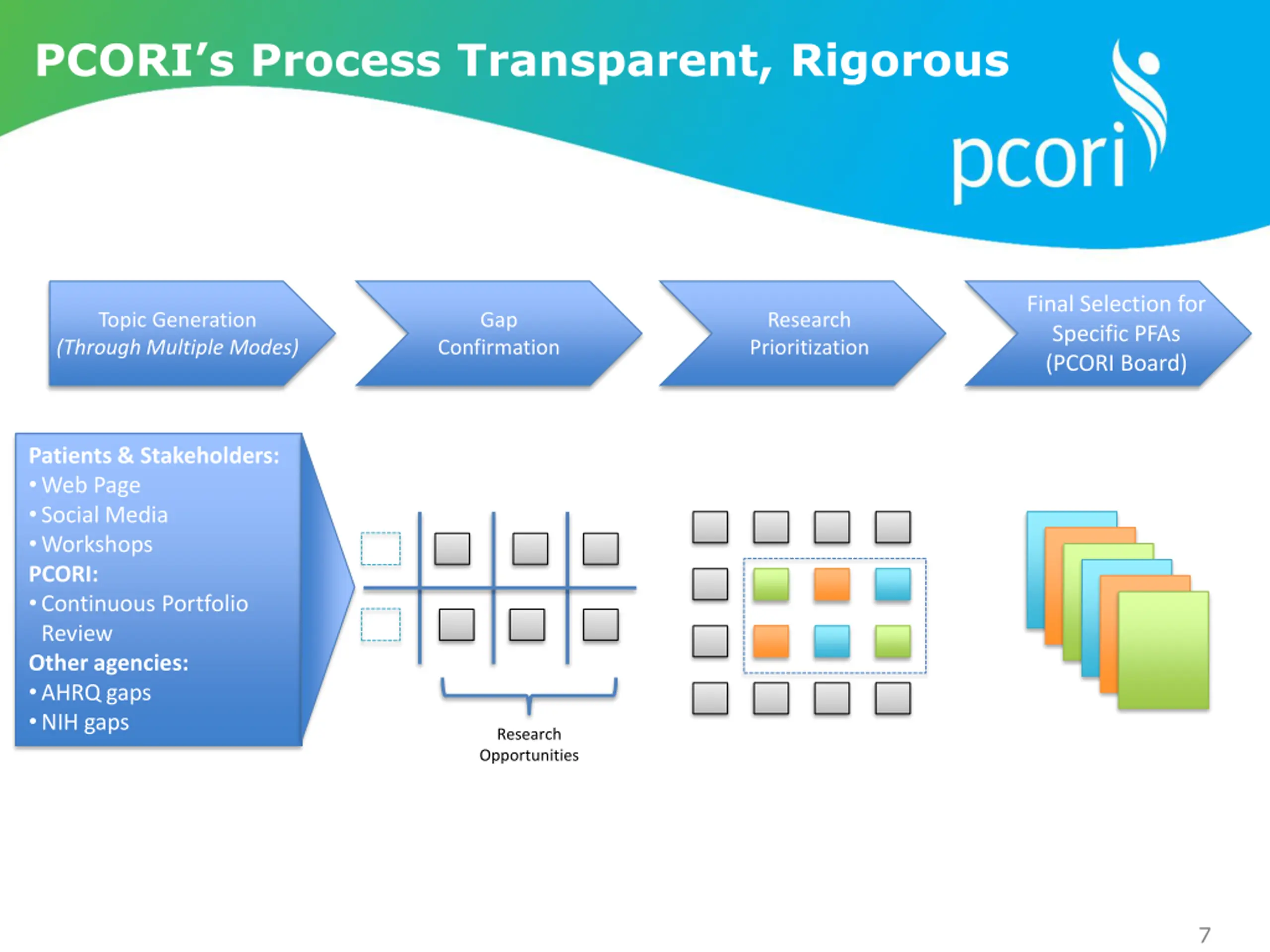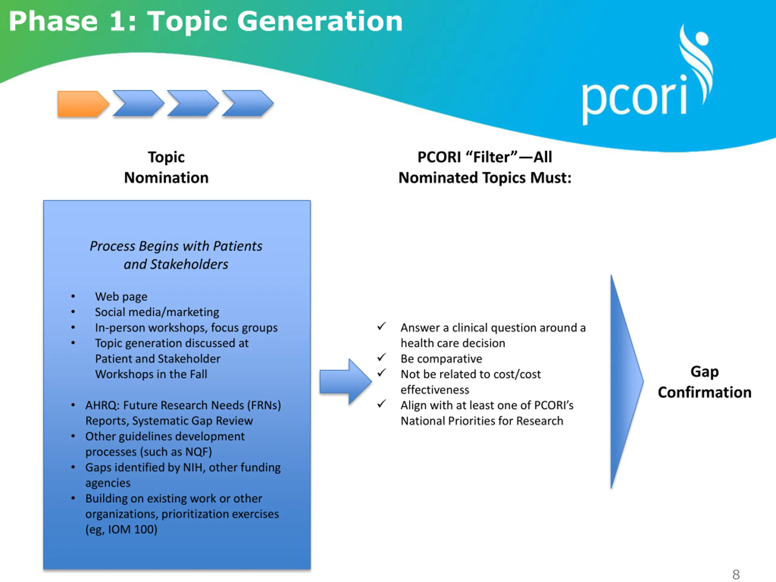 PCORIs Process Transparent, Rigorous Final Selection for Specific PFAs (PCORI Board) Topic Generation (Through Multiple Modes) Gap Research Prioritization Confirmation Patients & Stakeholders: Web Page Social Media Workshops PCORI: Continuous Portfolio Review Other agencies: AHRQ gaps NIH gaps Research Opportunities 7