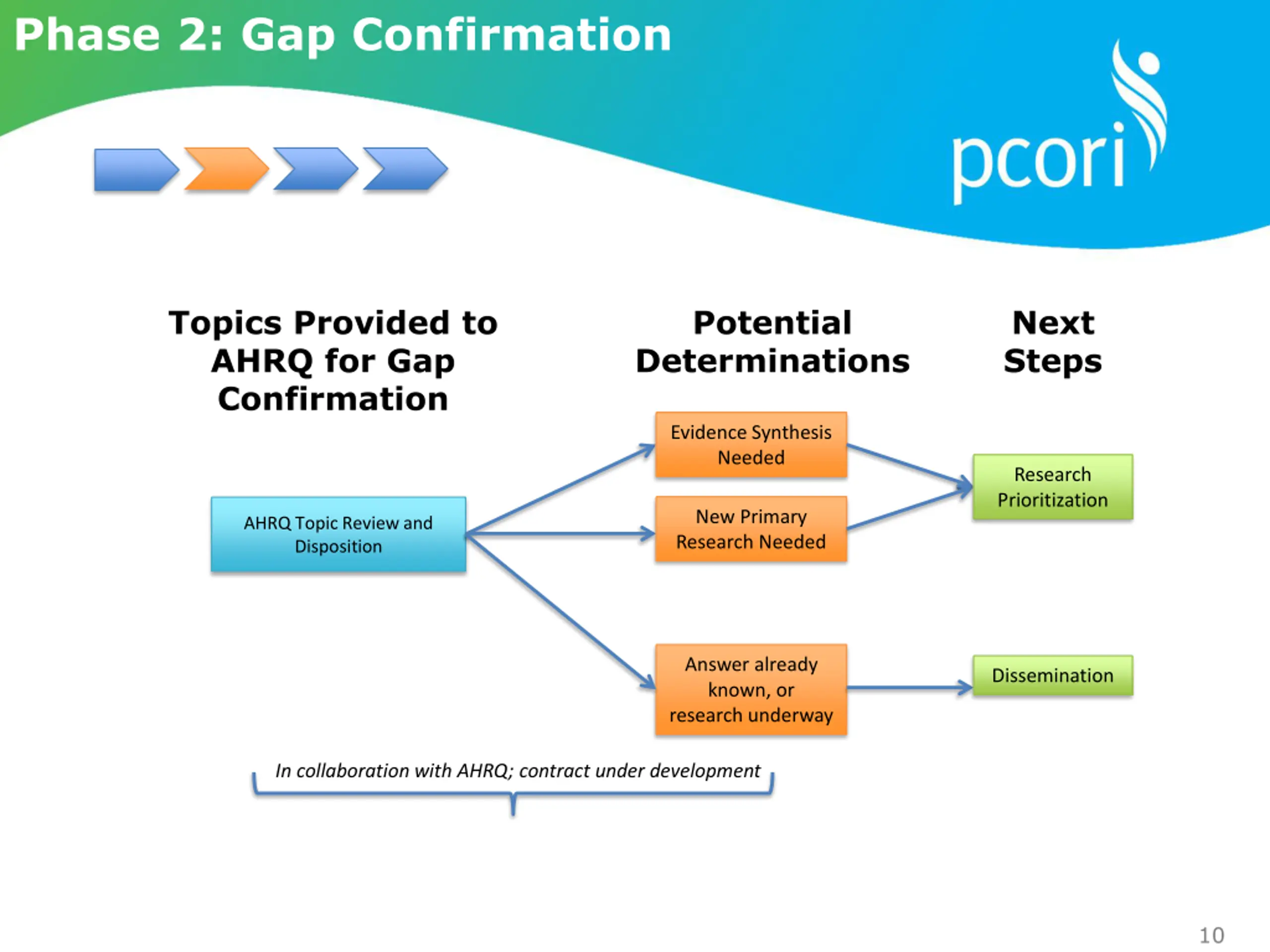 Phase 2: Gap Confirmation Topics Provided to AHRQ for Gap Confirmation Potential Determinations Next Steps Evidence Synthesis Needed Research Prioritization New Primary Research Needed AHRQ Topic Review and Disposition Answer already known, or research underway Dissemination In collaboration with AHRQ; contract under development 10