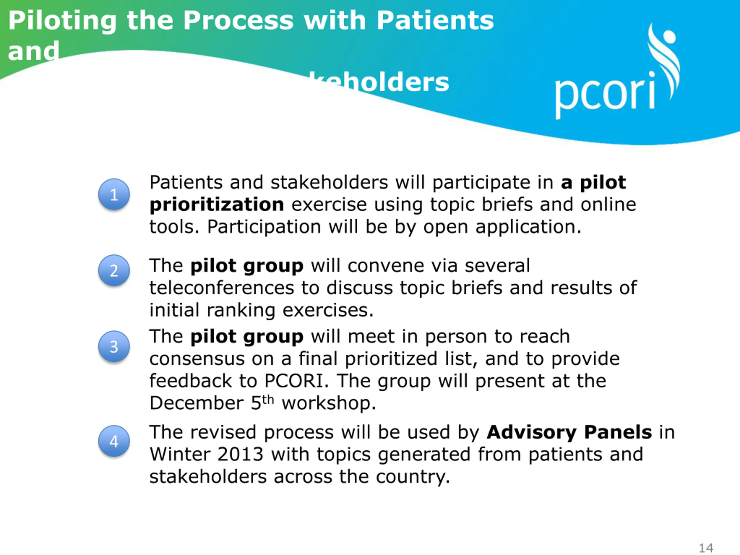 Piloting the Process with Patients and Stakeholders Patients and stakeholders will participate in a pilot prioritization exercise using topic briefs and online tools. Participation will be by open application. 1 The pilot group will convene via several teleconferences to discuss topic briefs and results of initial ranking exercises. The pilot group will meet in person to reach consensus on a final prioritized list, and to provide feedback to PCORI. The group will present at the December 5th workshop. 2 3 The revised process will be used by Advisory Panels in Winter 2013 with topics generated from patients and stakeholders across the country. 4 14