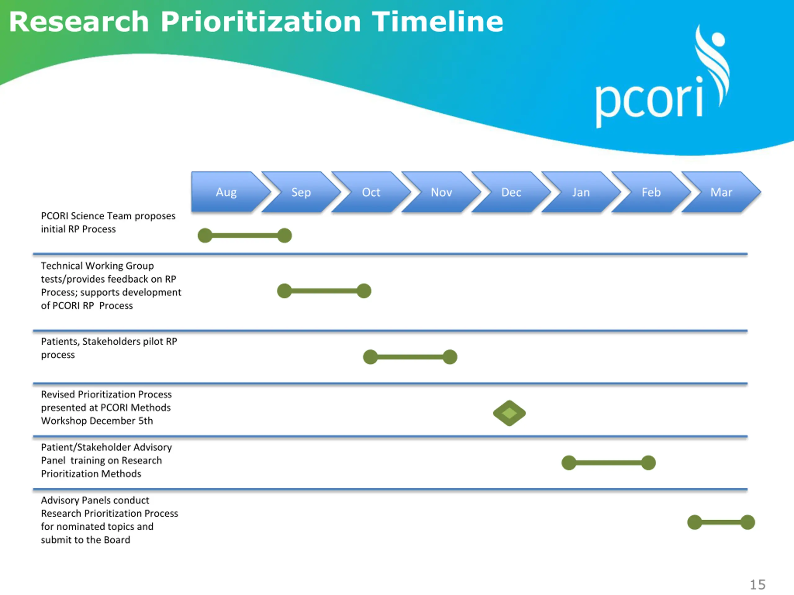 Research Prioritization Timeline Aug Sep Oct Nov Dec Jan Feb Mar PCORI Science Team proposes initial RP Process Technical Working Group tests/provides feedback on RP Process; supports development of PCORI RP Process Patients, Stakeholders pilot RP process Revised Prioritization Process presented at PCORI Methods Workshop December 5th Patient/Stakeholder Advisory Panel training on Research Prioritization Methods Advisory Panels conduct Research Prioritization Process for nominated topics and submit to the Board 15