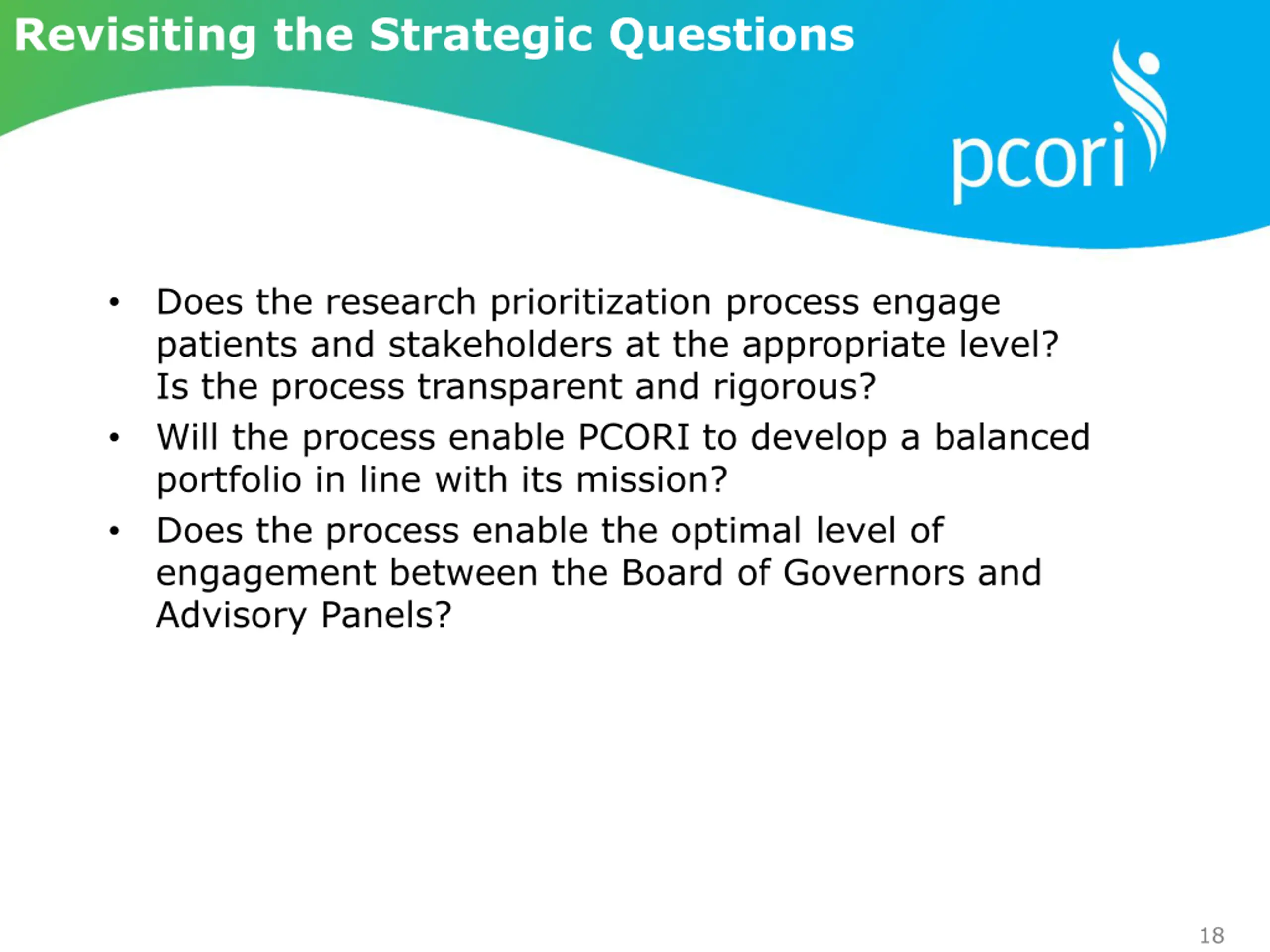 Revisiting the Strategic Questions Does the research prioritization process engage patients and stakeholders at the appropriate level? Is the process transparent and rigorous? Will the process enable PCORI to develop a balanced portfolio in line with its mission? Does the process enable the optimal level of engagement between the Board of Governors and Advisory Panels? 18