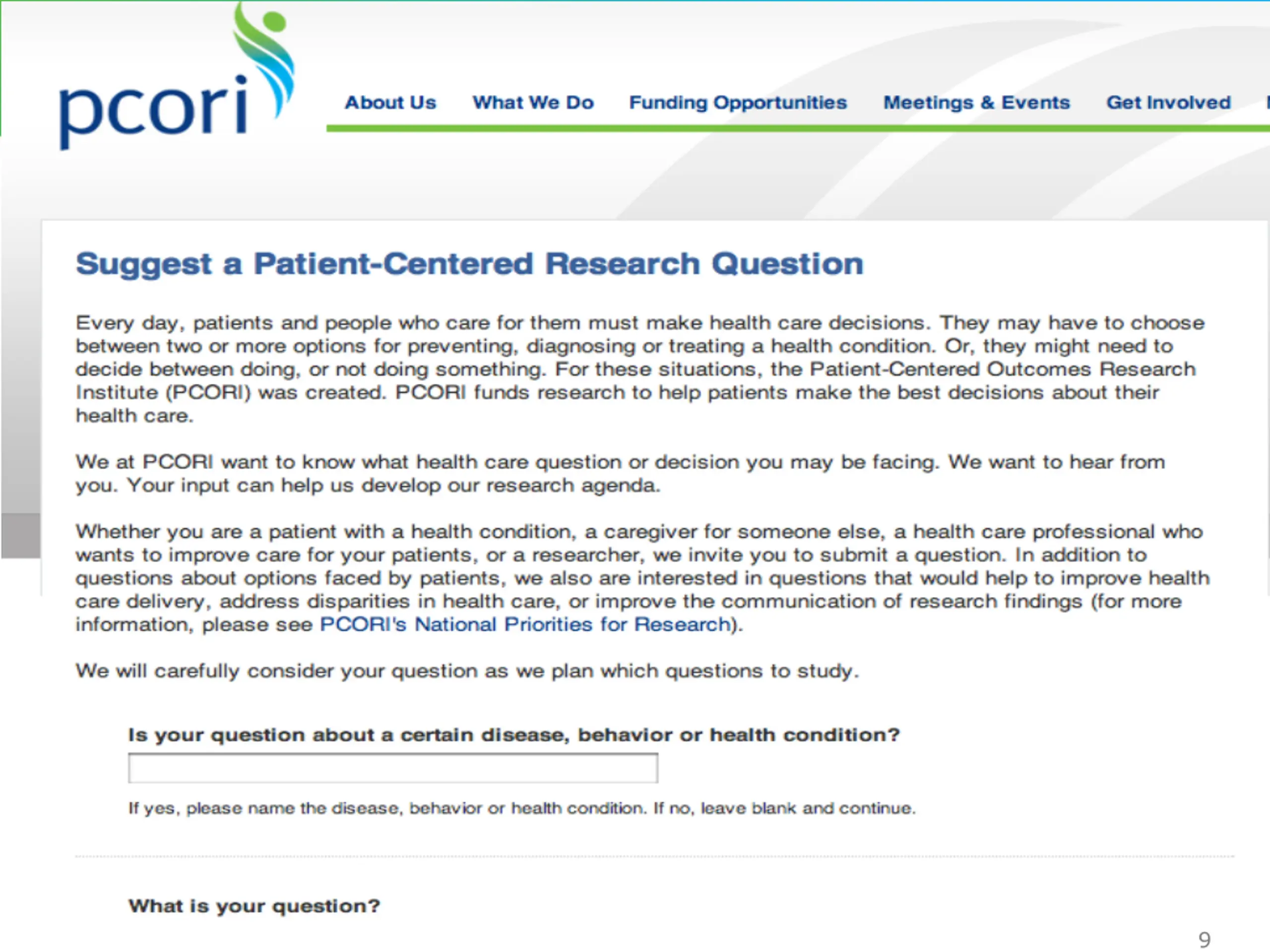 Phase 1: Topic Generation Topic PCORI Filter All Nominated Topics Must: Nomination Process Begins with Patients and Stakeholders Web page Social media/marketing In-person workshops, focus groups Topic generation discussed at Patient and Stakeholder Workshops in the Fall Answer a clinical question around a health care decision Be comparative Not be related to cost/cost effectiveness Align with at least one of PCORI s National Priorities for Research Gap Confirmation AHRQ: Future Research Needs (FRNs) Reports, Systematic Gap Review Other guidelines development processes (such as NQF) Gaps identified by NIH, other funding agencies Building on existing work or other organizations, prioritization exercises (eg, IOM 100) 8