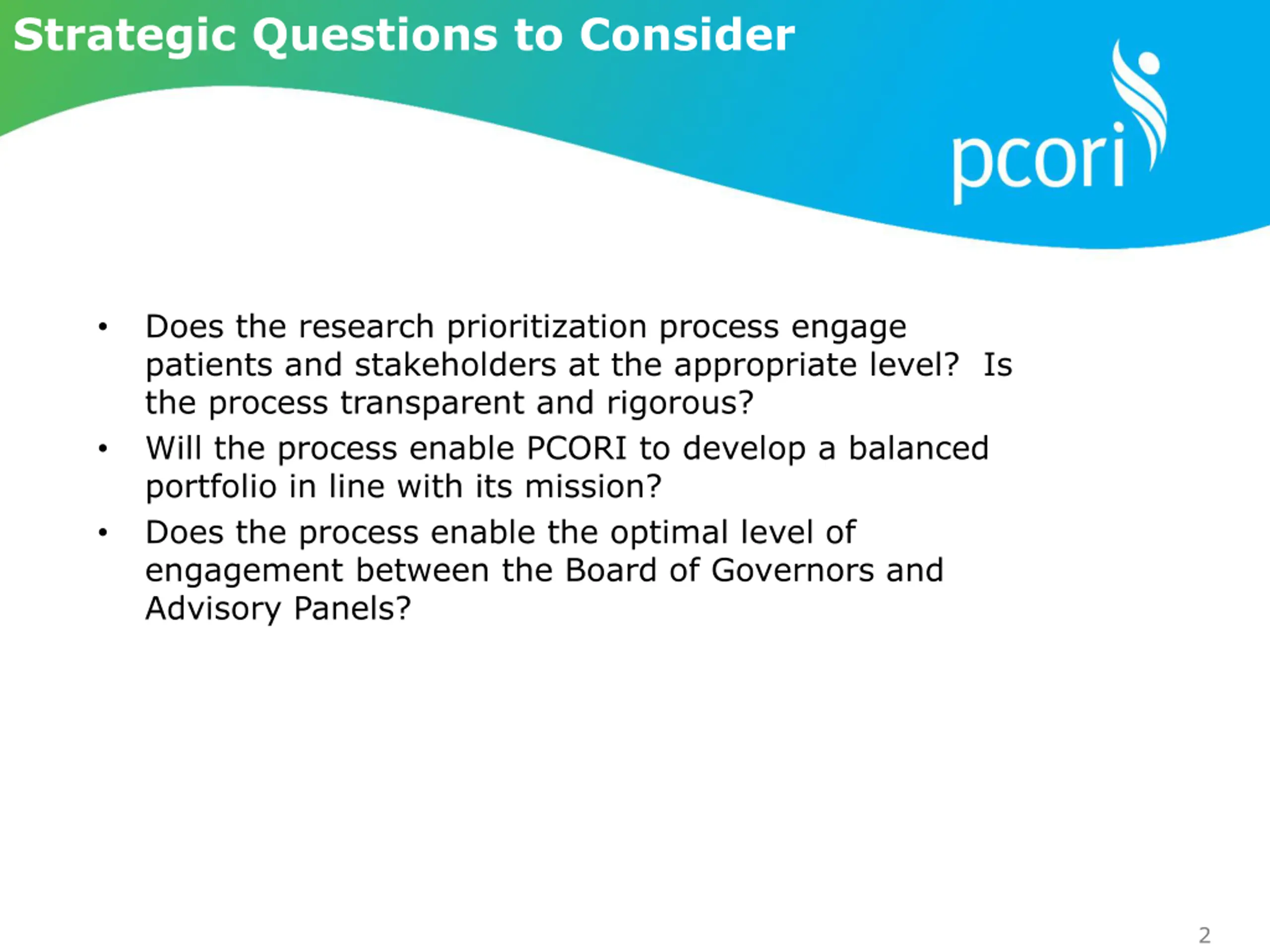 Strategic Questions to Consider Strategic questions to consider Does the research prioritization process engage patients and stakeholders at the appropriate level? Is the process transparent and rigorous? Will the process enable PCORI to develop a balanced portfolio in line with its mission? Does the process enable the optimal level of engagement between the Board of Governors and Advisory Panels? 2