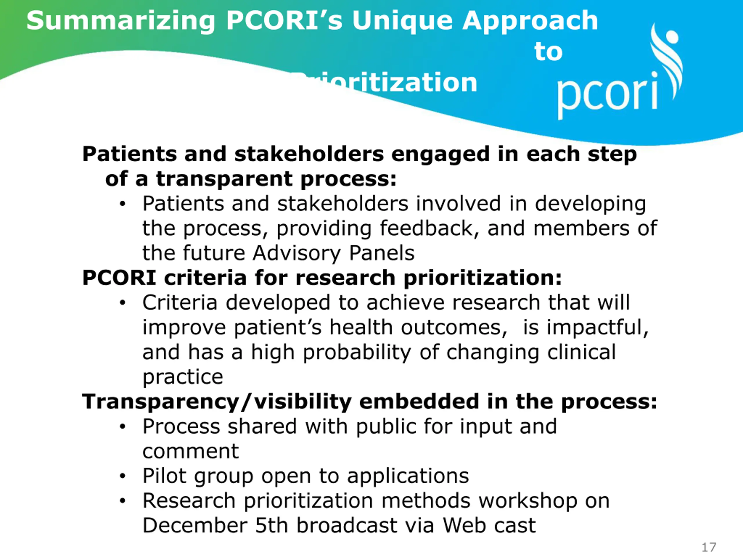 PCORIs Research Prioritization Team PCORI Staff and Leadership: Joe Selby, Executive Director Rachael Fleurence, Scientist Katie Wilson, Project Management Natalie Wegener, Project Coordination Technical Working Group: Arnie Epstein (BoG) Gail Hunt (BoG) Neil Kirschner (Stakeholder Representative) David Meltzer (Methodology Committee) Linda Morgan, RPh, MBA (Patient Representative) Jean Slutsky (Methodology Committee) Clyde Yancy (Methodology Committee) Pilot Workshop Participants: Approximately 15-20 patients, stakeholders, researchers, and experts trained and prepared in PCORI s research prioritization process 16