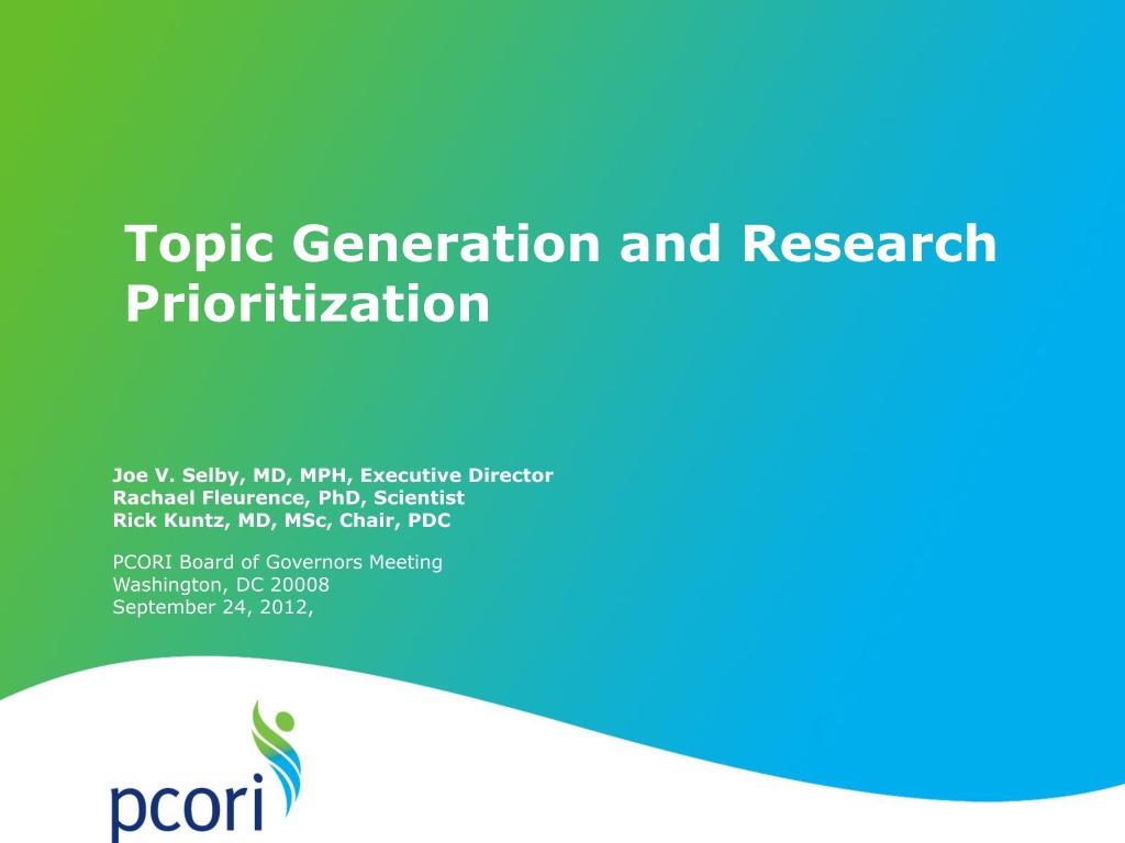 Topic Generation and Research Prioritization Joe V. Selby, MD, MPH, Executive Director Rachael Fleurence, PhD, Scientist Rick Kuntz, MD, MSc, Chair, PDC PCORI Board of Governors Meeting Washington, DC 20008 September 24, 2012,