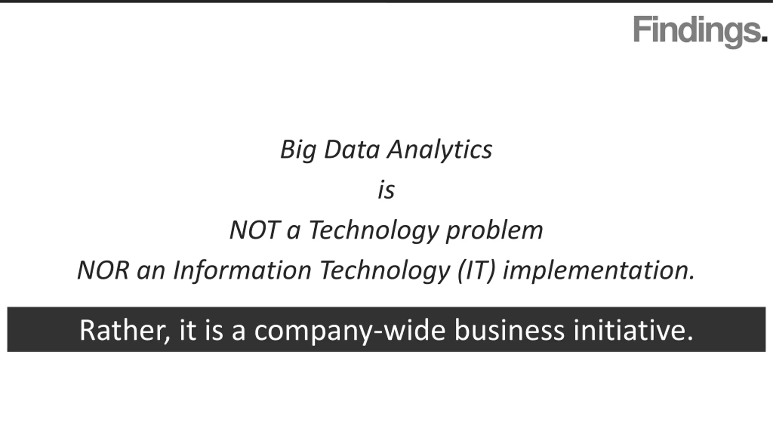 Findings. Big Data Analytics is NOT a Technology problem NOR an Information Technology (IT) implementation. Rather, it is a company-wide business initiative.