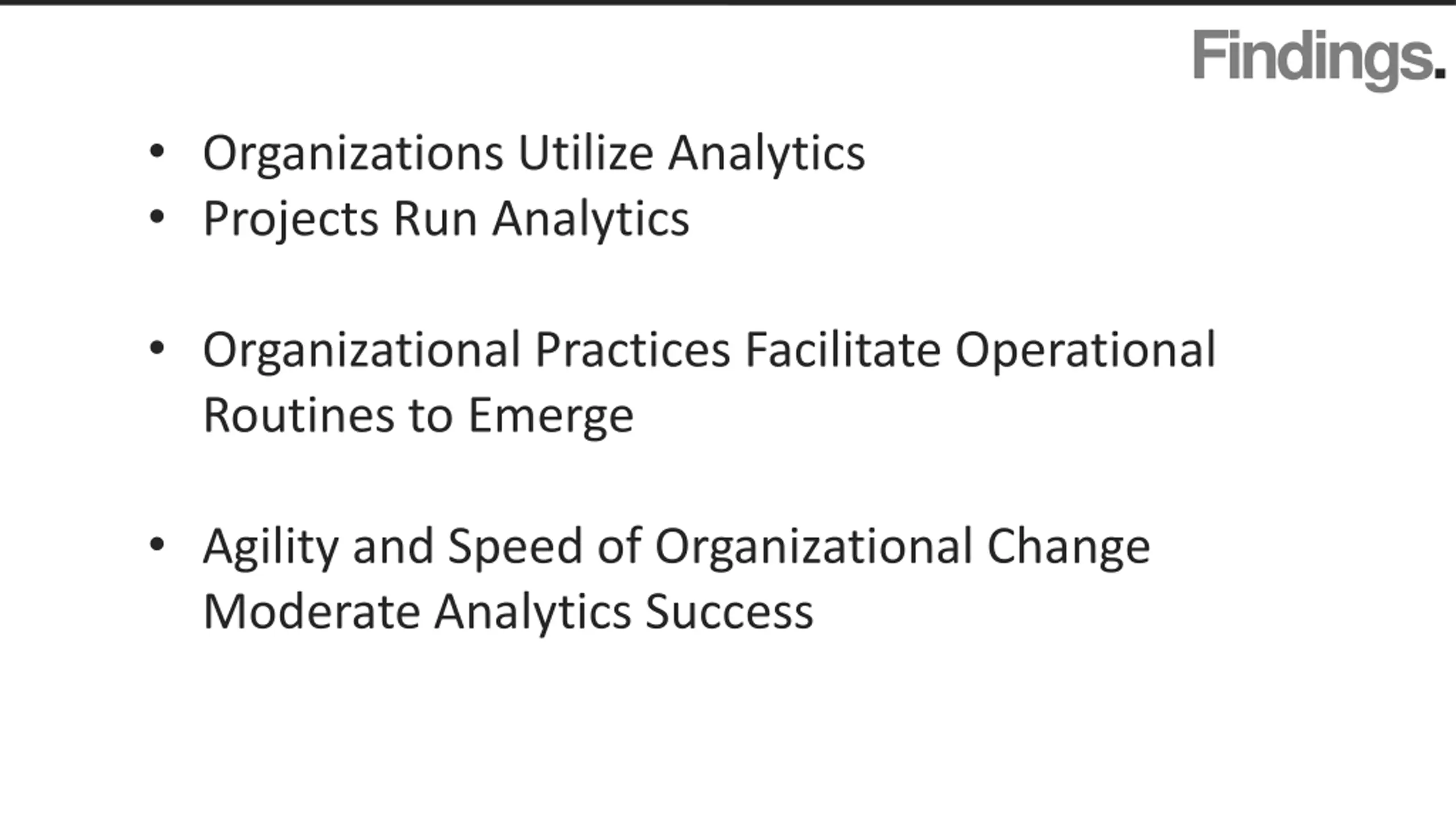 Findings. Organizations Utilize Analytics Projects Run Analytics Organizational Practices Facilitate Operational Routines to Emerge Agility and Speed of Organizational Change Moderate Analytics Success
