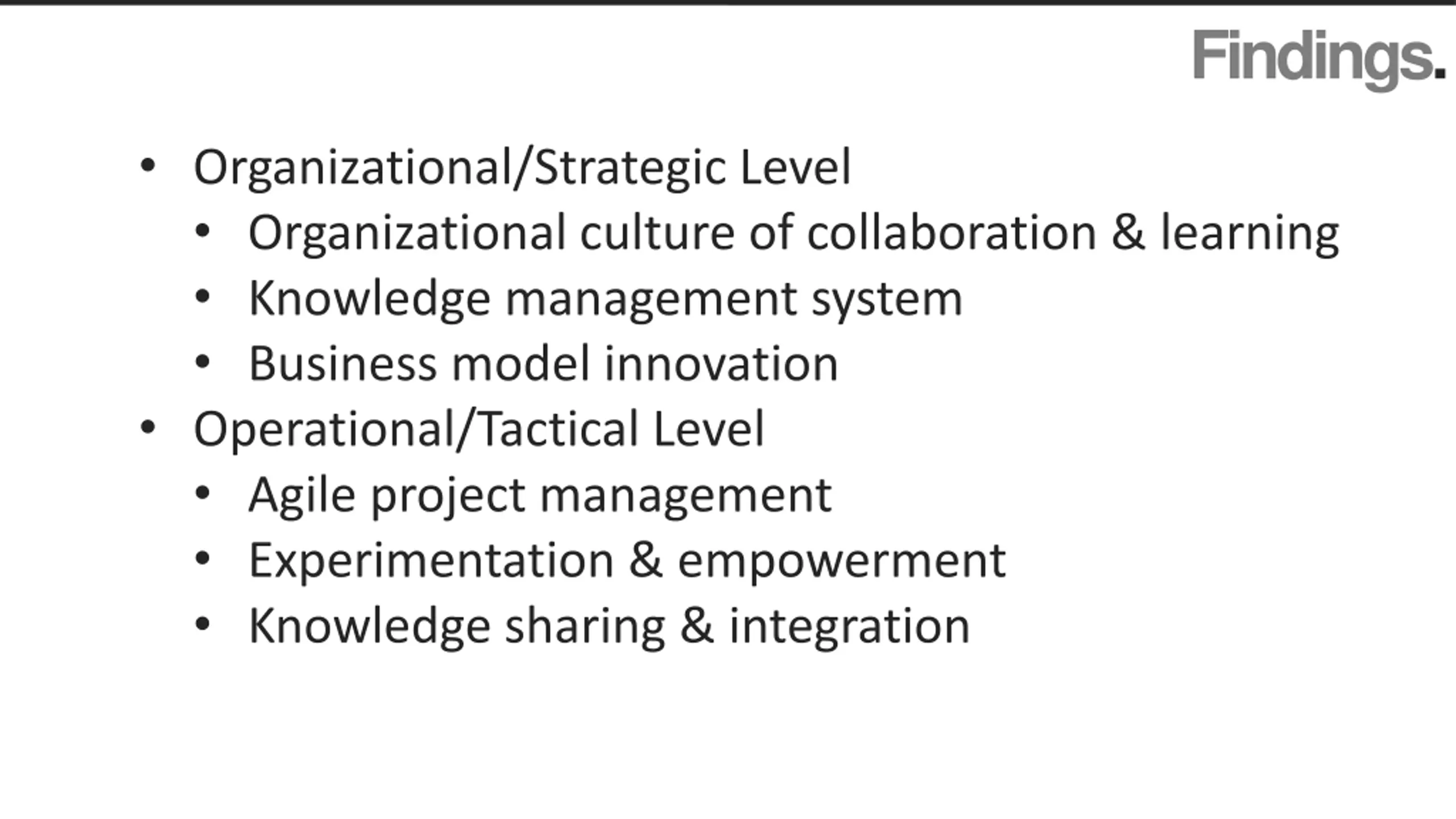 Findings. Organizational/Strategic Level Organizational culture of collaboration & learning Knowledge management system Business model innovation Operational/Tactical Level Agile project management Experimentation & empowerment Knowledge sharing & integration