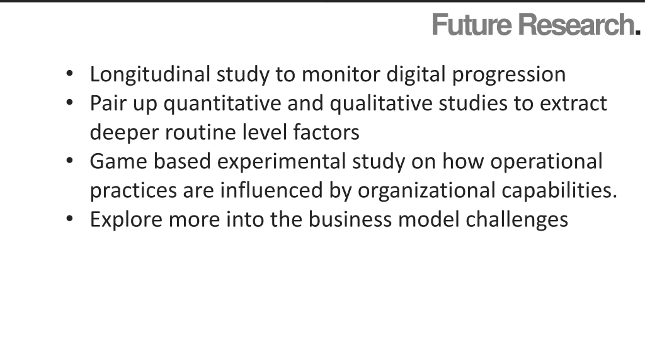 Future Research. Longitudinal study to monitor digital progression Pair up quantitative and qualitative studies to extract deeper routine level factors Game based experimental study on how operational practices are influenced by organizational capabilities. Explore more into the business model challenges