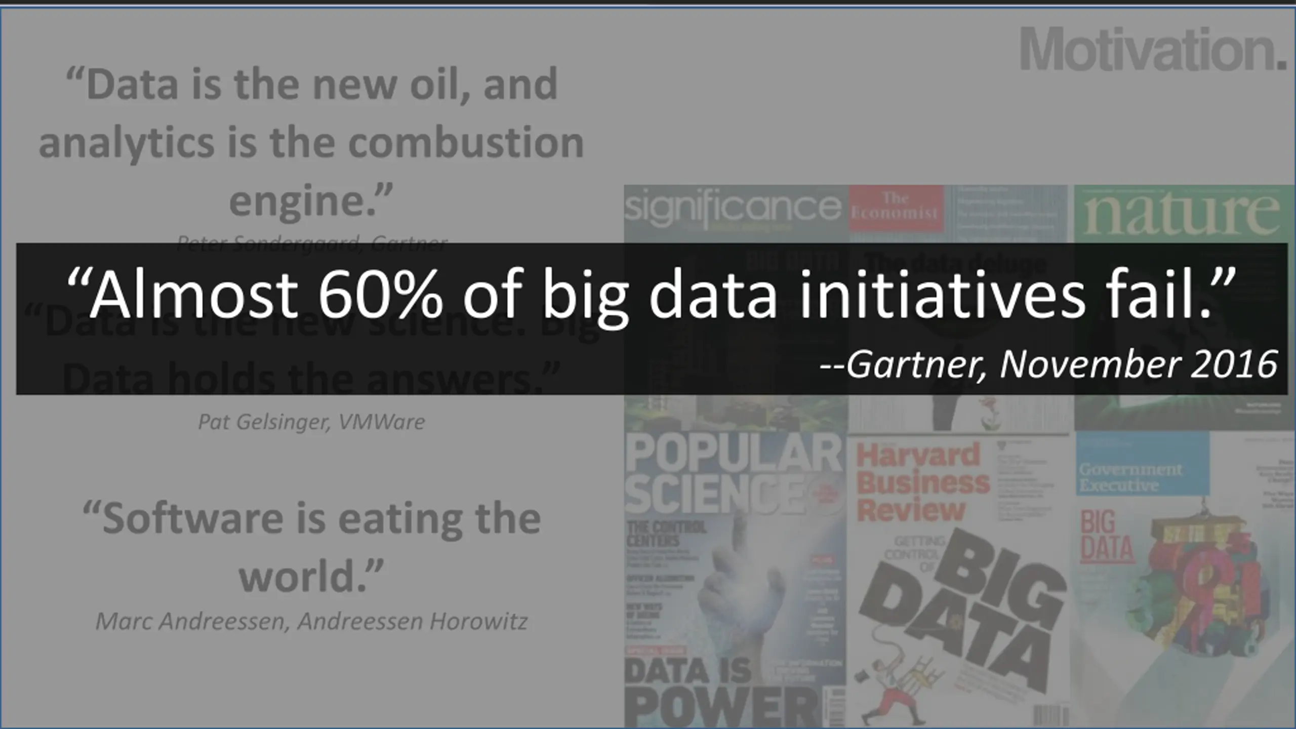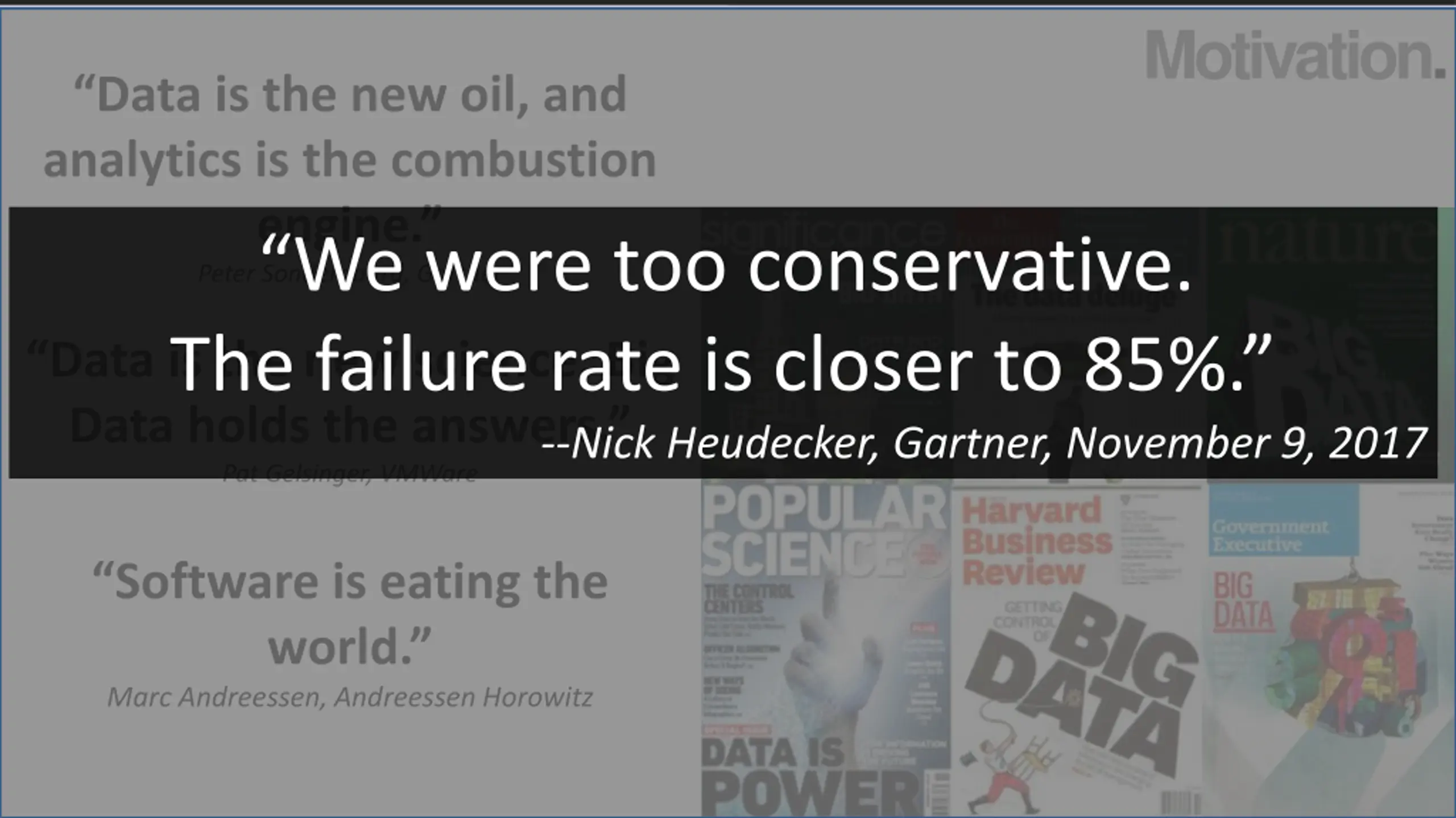 Motivation. Data is the new oil, and analytics is the combustion engine. Peter Sondergaard, Gartner We were too conservative. The failure rate is closer to 85%. --Nick Heudecker, Gartner, November 9, 2017 Data is the new science. Big Data holds the answers. Pat Gelsinger, VMWare Software is eating the world. Marc Andreessen, Andreessen Horowitz
