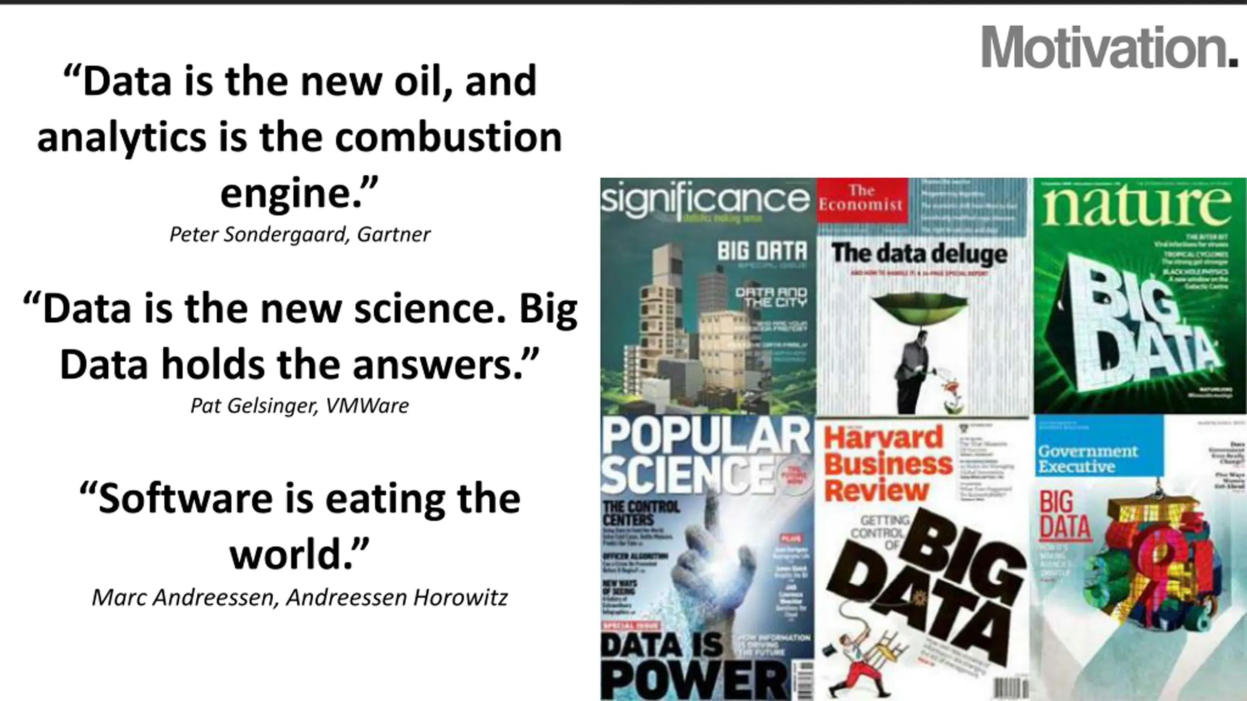 Motivation. Data is the new oil, and analytics is the combustion engine. Peter Sondergaard, Gartner Data is the new science. Big Data holds the answers. Pat Gelsinger, VMWare Software is eating the world. Marc Andreessen, Andreessen Horowitz