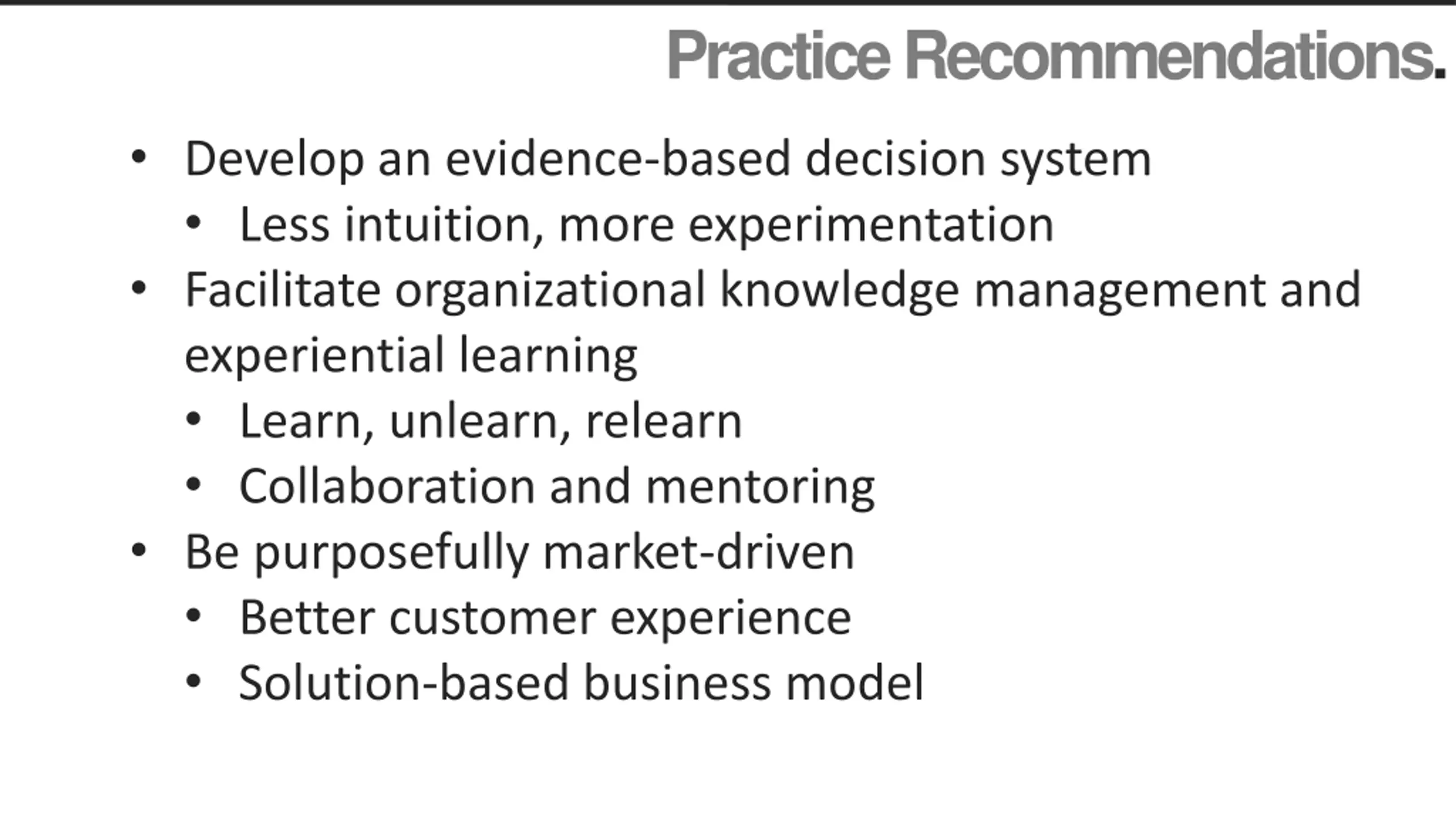 Practice Recommendations. Develop an evidence-based decision system Less intuition, more experimentation Facilitate organizational knowledge management and experiential learning Learn, unlearn, relearn Collaboration and mentoring Be purposefully market-driven Better customer experience Solution-based business model