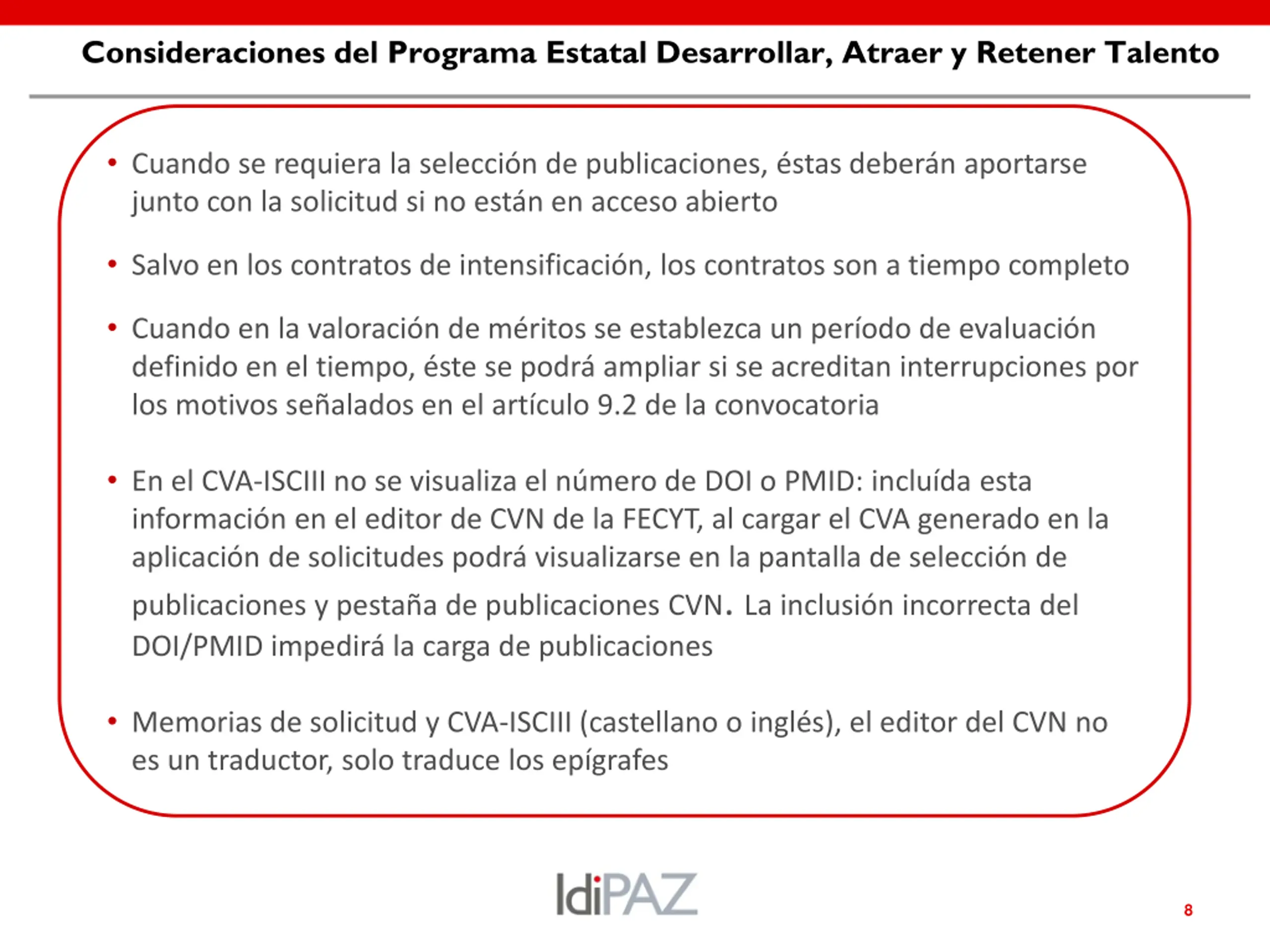 Consideraciones del Programa Estatal Desarrollar, Atraer y Retener Talento Cuando se requiera la selecci n de publicaciones, stas deber n aportarse junto con la solicitud si no est n en acceso abierto Salvo en los contratos de intensificaci n, los contratos son a tiempo completo Cuando en la valoraci n de m ritos se establezca un per odo de evaluaci n definido en el tiempo, ste se podr ampliar si se acreditan interrupciones por los motivos se alados en el art culo 9.2 de la convocatoria En el CVA-ISCIII no se visualiza el n mero de DOI o PMID: inclu da esta informaci n en el editor de CVN de la FECYT, al cargar el CVA generado en la aplicaci n de solicitudes podr visualizarse en la pantalla de selecci n de publicaciones y pesta a de publicaciones CVN. La inclusi n incorrecta del DOI/PMID impedir la carga de publicaciones Memorias de solicitud y CVA-ISCIII (castellano o ingl s), el editor del CVN no es un traductor, solo traduce los ep grafes 8