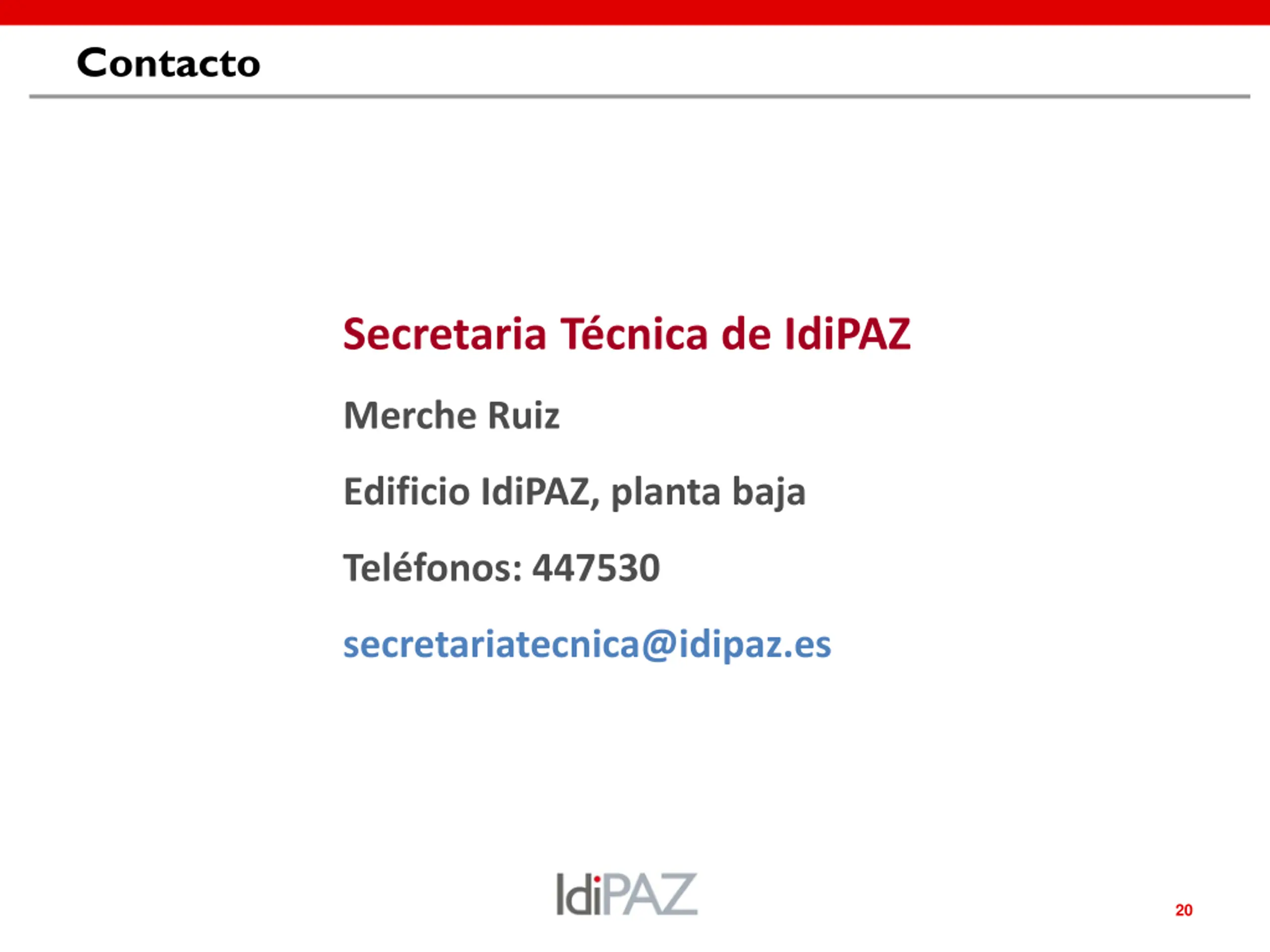 Contacto Secretaria T cnica de IdiPAZ Merche Ruiz Edificio IdiPAZ, planta baja Tel fonos: 447530 secretariatecnica@idipaz.es 20