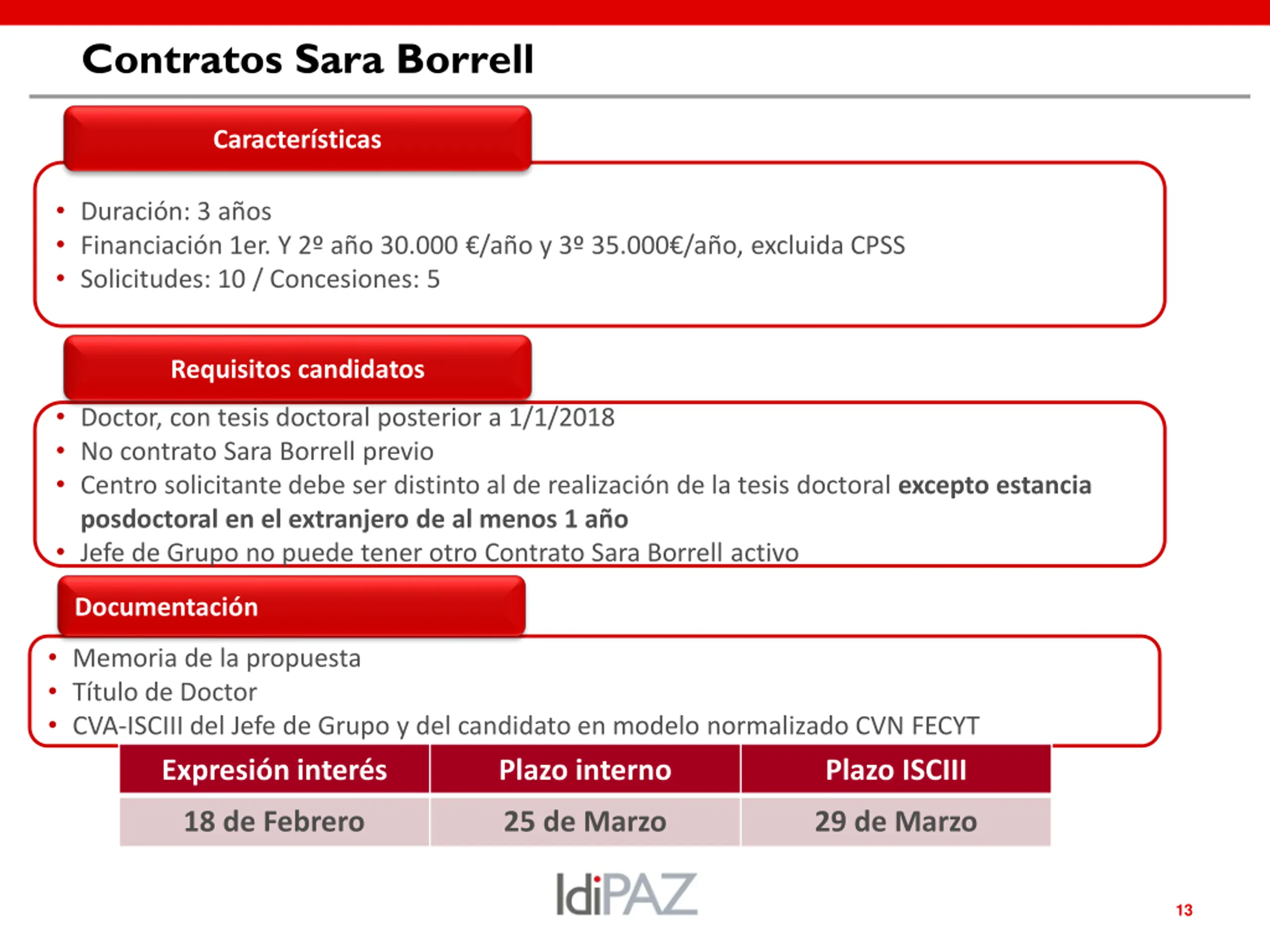 Contratos Sara Borrell Caracter sticas Duraci n: 3 a os Financiaci n 1er. Y 2 a o 30.000 /a o y 3 35.000 /a o, excluida CPSS Solicitudes: 10 / Concesiones: 5 Requisitos candidatos Doctor, con tesis doctoral posterior a 1/1/2018 No contrato Sara Borrell previo Centro solicitante debe ser distinto al de realizaci n de la tesis doctoral excepto estancia posdoctoral en el extranjero de al menos 1 a o Jefe de Grupo no puede tener otro Contrato Sara Borrell activo Documentaci n Memoria de la propuesta T tulo de Doctor CVA-ISCIII del Jefe de Grupo y del candidato en modelo normalizado CVN FECYT Expresi n inter s Plazo interno Plazo ISCIII 18 de Febrero 25 de Marzo 29 de Marzo 13