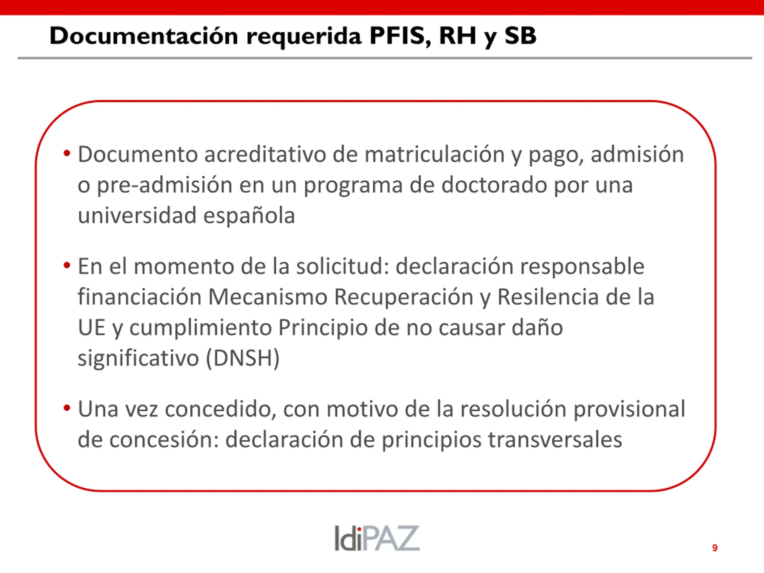 Documentacin requerida PFIS, RH y SB Documento acreditativo de matriculaci n y pago, admisi n o pre-admisi n en un programa de doctorado por una universidad espa ola En el momento de la solicitud: declaraci n responsable financiaci n Mecanismo Recuperaci n y Resilencia de la UE y cumplimiento Principio de no causar da o significativo (DNSH) Una vez concedido, con motivo de la resoluci n provisional de concesi n: declaraci n de principios transversales 9