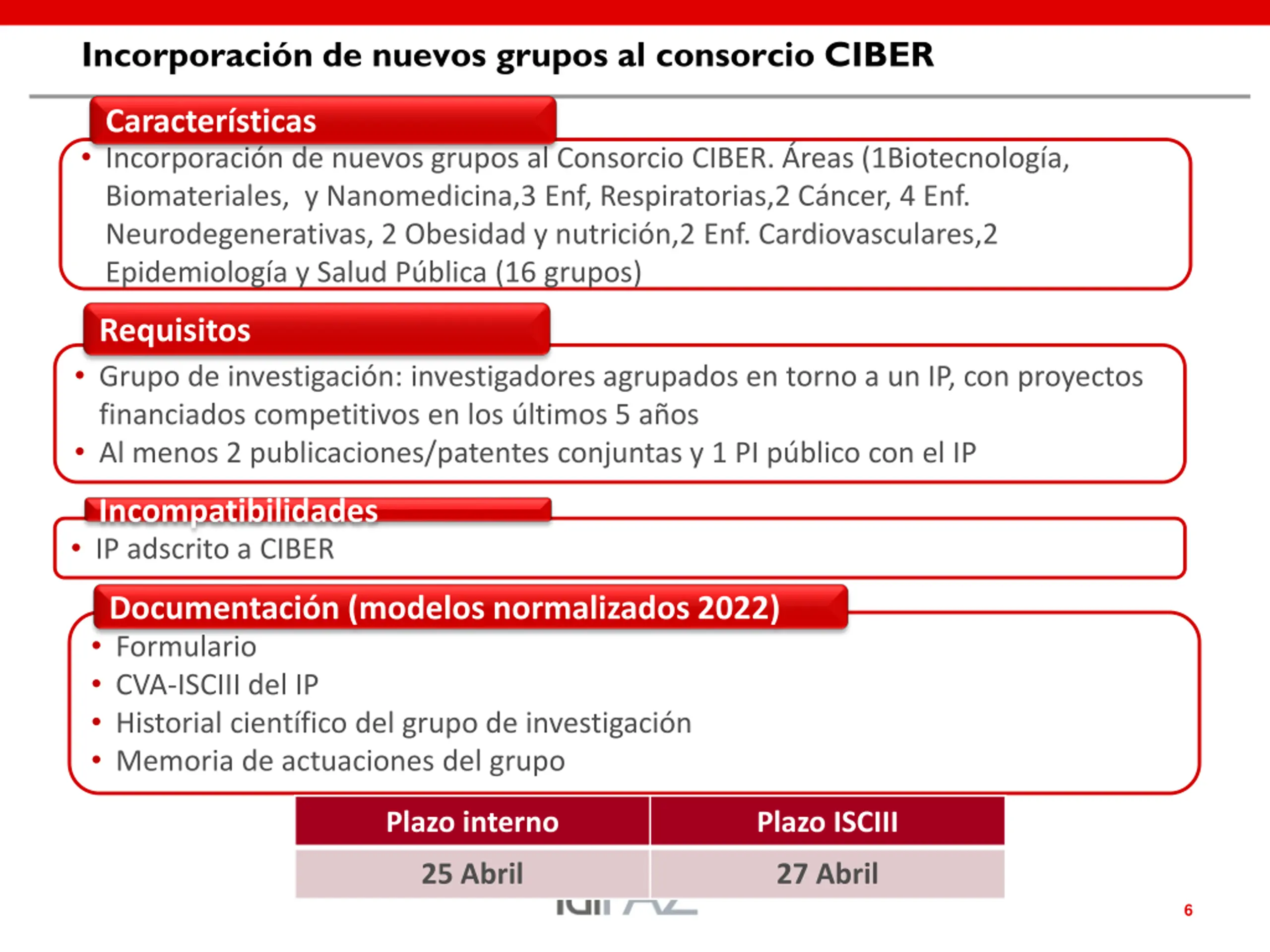 Incorporacin de nuevos grupos al consorcio CIBER Caracter sticas Incorporaci n de nuevos grupos al Consorcio CIBER. reas (1Biotecnolog a, Biomateriales, y Nanomedicina,3 Enf, Respiratorias,2 C ncer, 4 Enf. Neurodegenerativas, 2 Obesidad y nutrici n,2 Enf. Cardiovasculares,2 Epidemiolog a y Salud P blica (16 grupos) Requisitos Grupo de investigaci n: investigadores agrupados en torno a un IP, con proyectos financiados competitivos en los ltimos 5 a os Al menos 2 publicaciones/patentes conjuntas y 1 PI p blico con el IP Incompatibilidades IP adscrito a CIBER Documentaci n (modelos normalizados 2022) Formulario CVA-ISCIII del IP Historial cient fico del grupo de investigaci n Memoria de actuaciones del grupo Plazo interno Plazo ISCIII 25 Abril 27 Abril 6