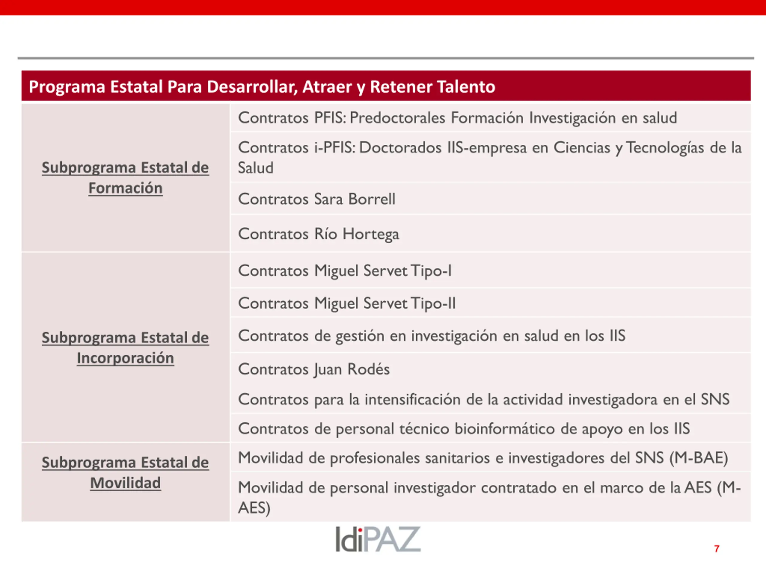 Programa Estatal Para Desarrollar, Atraer y Retener Talento Contratos PFIS: Predoctorales Formaci n Investigaci n en salud Contratos i-PFIS: Doctorados IIS-empresa en Ciencias y Tecnolog as de la Salud Subprograma Estatal de Formaci n Contratos Sara Borrell Contratos R o Hortega Contratos Miguel Servet Tipo-I Contratos Miguel Servet Tipo-II Contratos de gesti n en investigaci n en salud en los IIS Subprograma Estatal de Incorporaci n Contratos Juan Rod s Contratos para la intensificaci n de la actividad investigadora en el SNS Contratos de personal t cnico bioinform tico de apoyo en los IIS Movilidad de profesionales sanitarios e investigadores del SNS (M-BAE) Subprograma Estatal de Movilidad Movilidad de personal investigador contratado en el marco de la AES (M- AES) 7
