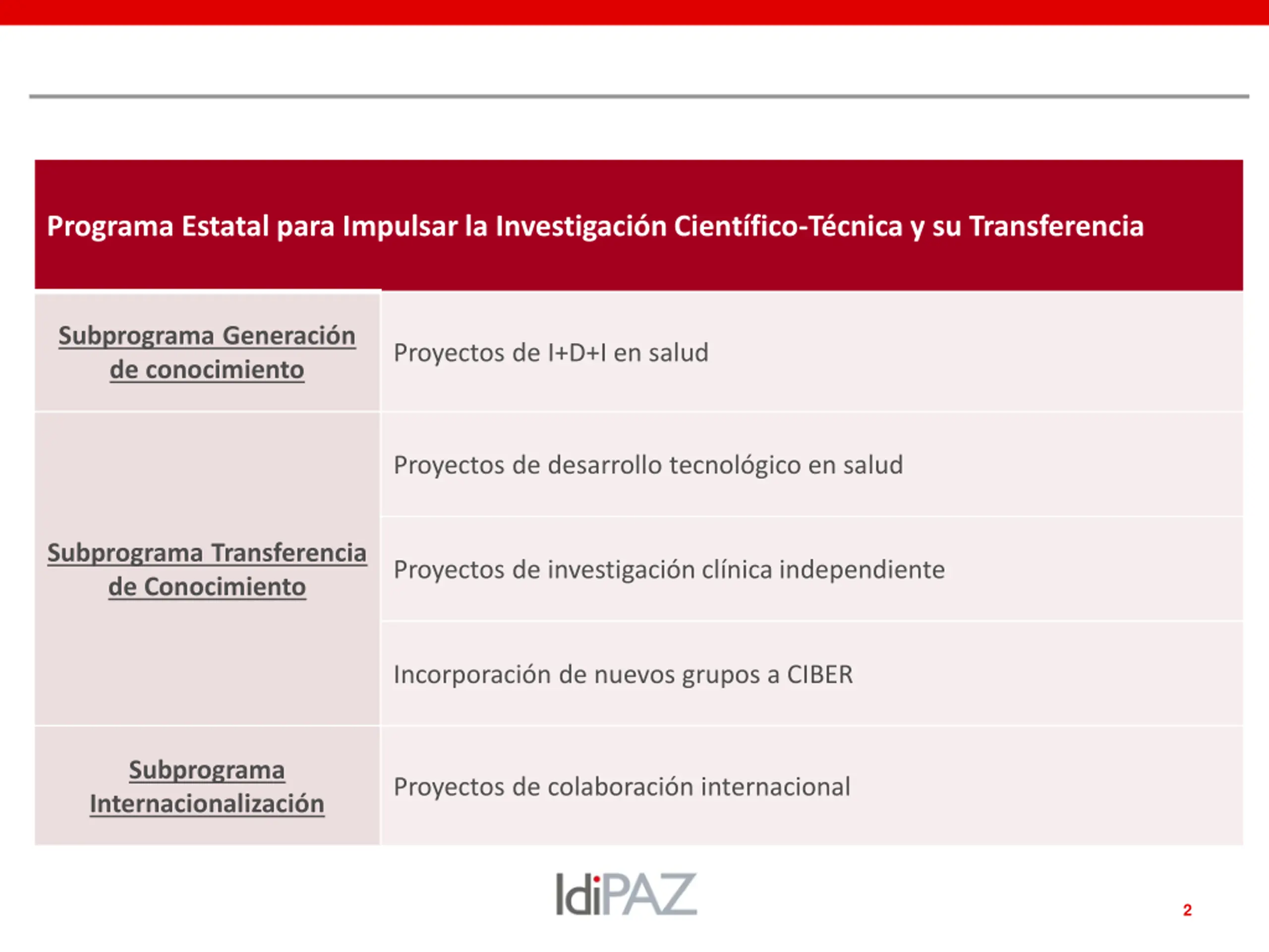 Programa Estatal para Impulsar la Investigacin Cientfico-Tcnica y su Transferencia Subprograma Generaci n de conocimiento Proyectos de I+D+I en salud Proyectos de desarrollo tecnol gico en salud Subprograma Transferencia de Conocimiento Proyectos de investigaci n cl nica independiente Incorporaci n de nuevos grupos a CIBER Subprograma Internacionalizaci n Proyectos de colaboraci n internacional 2