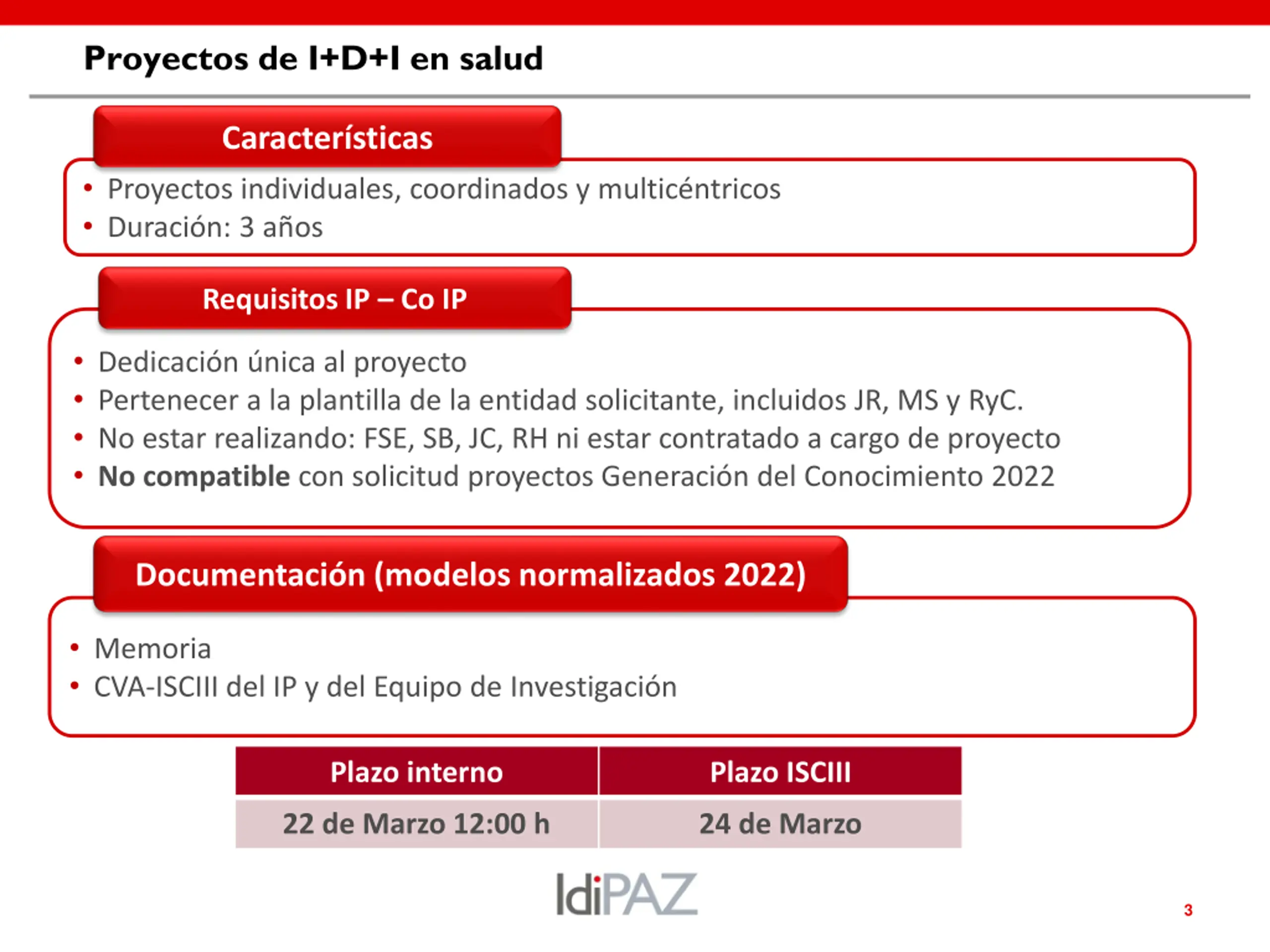Proyectos de I+D+I en salud Caracter sticas Proyectos individuales, coordinados y multic ntricos Duraci n: 3 a os Requisitos IP Co IP Dedicaci n nica al proyecto Pertenecer a la plantilla de la entidad solicitante, incluidos JR, MS y RyC. No estar realizando: FSE, SB, JC, RH ni estar contratado a cargo de proyecto No compatible con solicitud proyectos Generaci n del Conocimiento 2022 Documentaci n (modelos normalizados 2022) Memoria CVA-ISCIII del IP y del Equipo de Investigaci n Plazo interno Plazo ISCIII 22 de Marzo 12:00 h 24 de Marzo 3