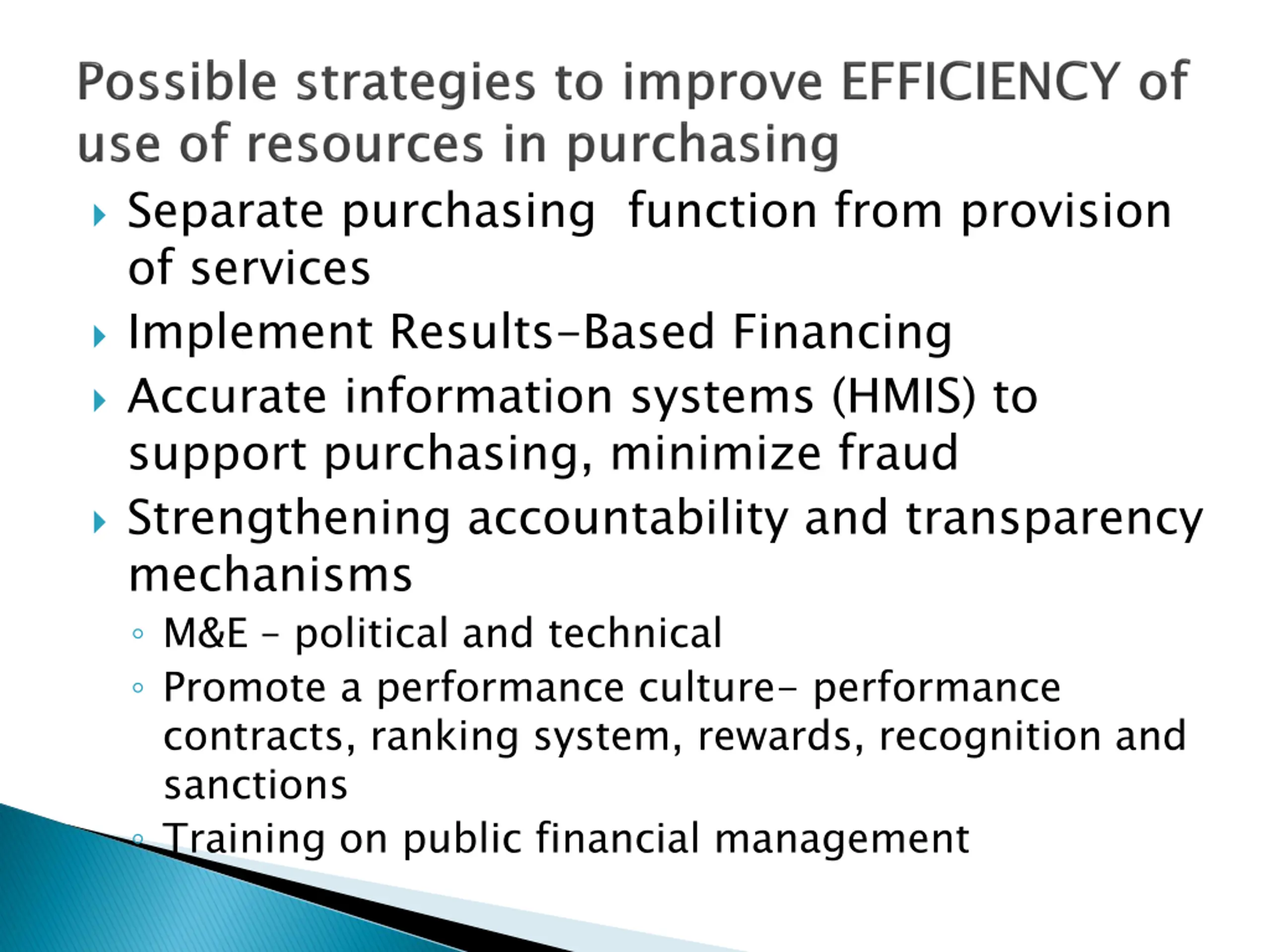 Separate purchasing function from provision of services Implement Results-Based Financing Accurate information systems (HMIS) to support purchasing, minimize fraud Strengthening accountability and transparency mechanisms M&E political and technical Promote a performance culture- performance contracts, ranking system, rewards, recognition and sanctions Training on public financial management